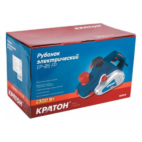 Электрический рубанок «Кратон» EP-05 FP синего цвета обладает массой 5 кг. Уровень потребляемой мощности не превышает 1300 Вт. Длина сетевого кабеля — 2 м. Габариты прибора составляют 20х20х35 см. Уровень шума в режиме активной эксплуатации не превышает 91 дБ. В комплекте поставляются параллельная направляющая, запасной комплект ножей, торцевой ключ, переходник для пылесоса и упор регулировки.