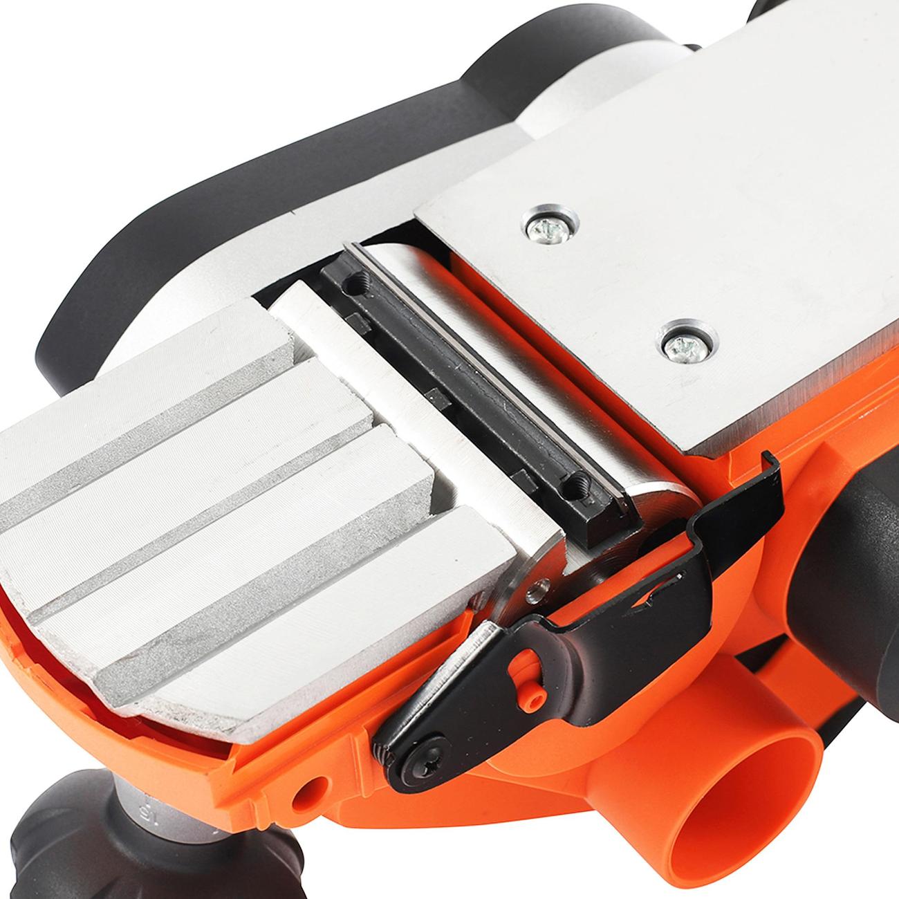 Нож выполнен из металла, корпус — из пластика. Ручка прорезинена для надежной фиксации в ладони. Устройство обладает функциями выборки четверти, блокировки кнопки включения и подключения к пылесосу. Ширина ножа — 82 мм. Глубина строгания регулируется от 1 до 3 мм.