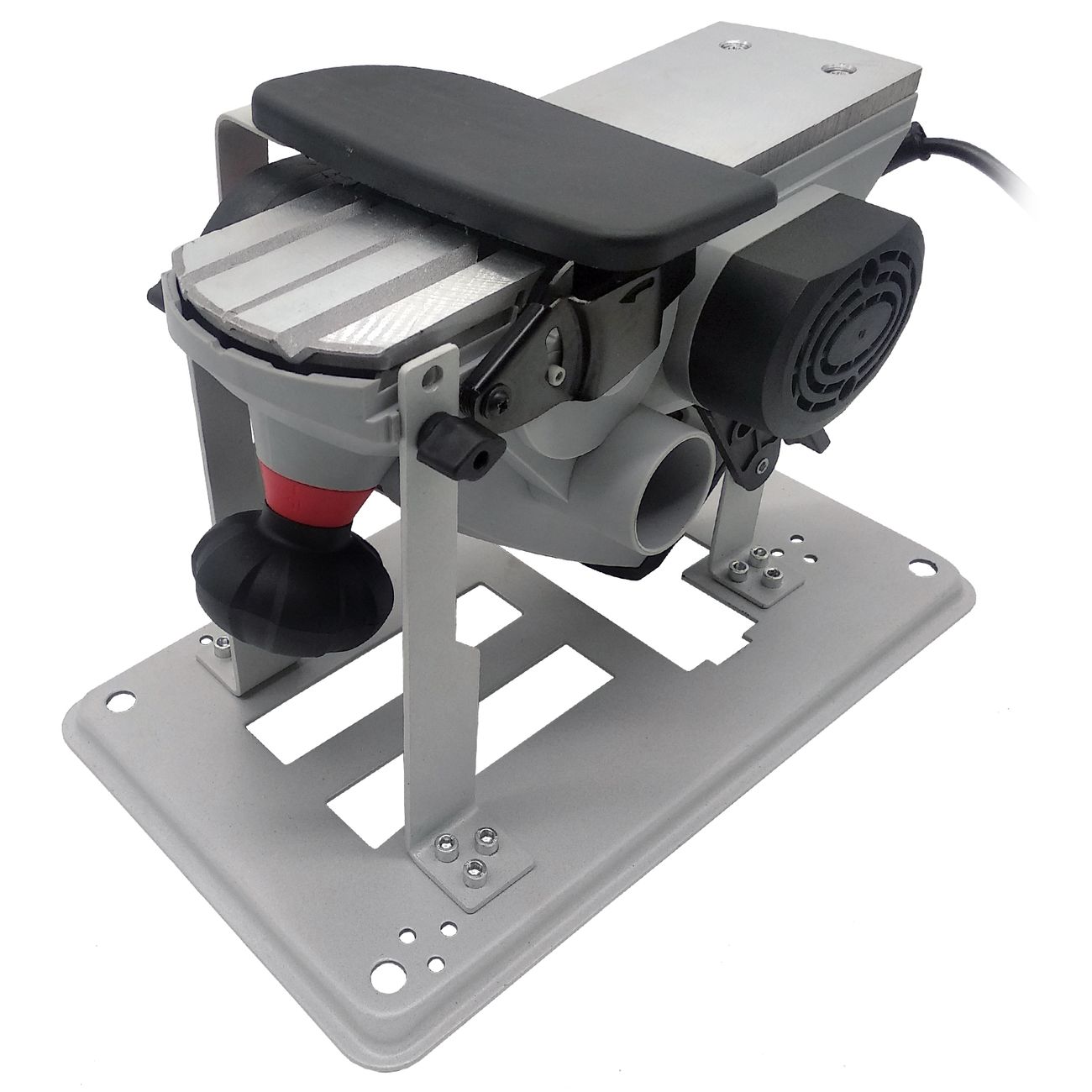 Инструмент можно устанавливать стационарно. В комплектацию входят станина с креплением, патрубок, направляющая линейка, ключ для замены лезвия и параллельный упор. Изделие весит 3 кг. Габариты — 21,6х42 см.