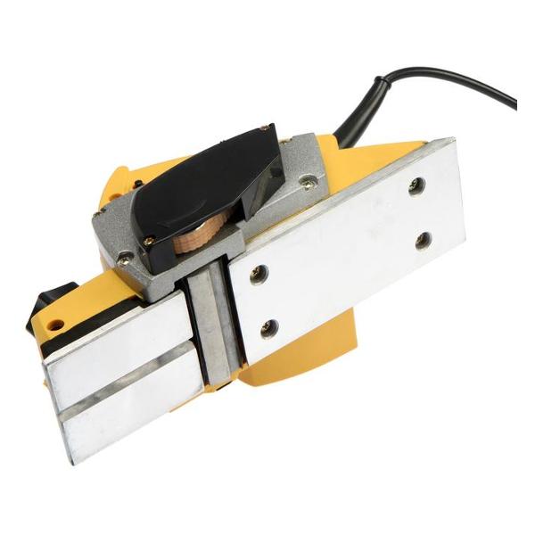 Электрический рубанок «Тундра» 5437464 заключен в пластиковый корпус желтого цвета и оснащен металлическим ножом шириной 82 мм. Модель весит 2,8 кг при размерах 17х16х30 см и питается от сети, потребляя 500 Вт мощности. На панели управления находится кнопка блокировки запуска. В комплект входит одна насадка. Установленный внутри двигатель обладает производительностью 16000 об/мин.