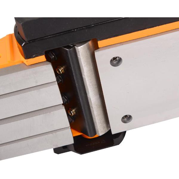 Корпус рубанка изготовлен из ударопрочного и износостойкого пластика. Стальные ножи можно менять. Вес инструмента составляет всего 5 кг, что позволяет брать его с собой на объекты.