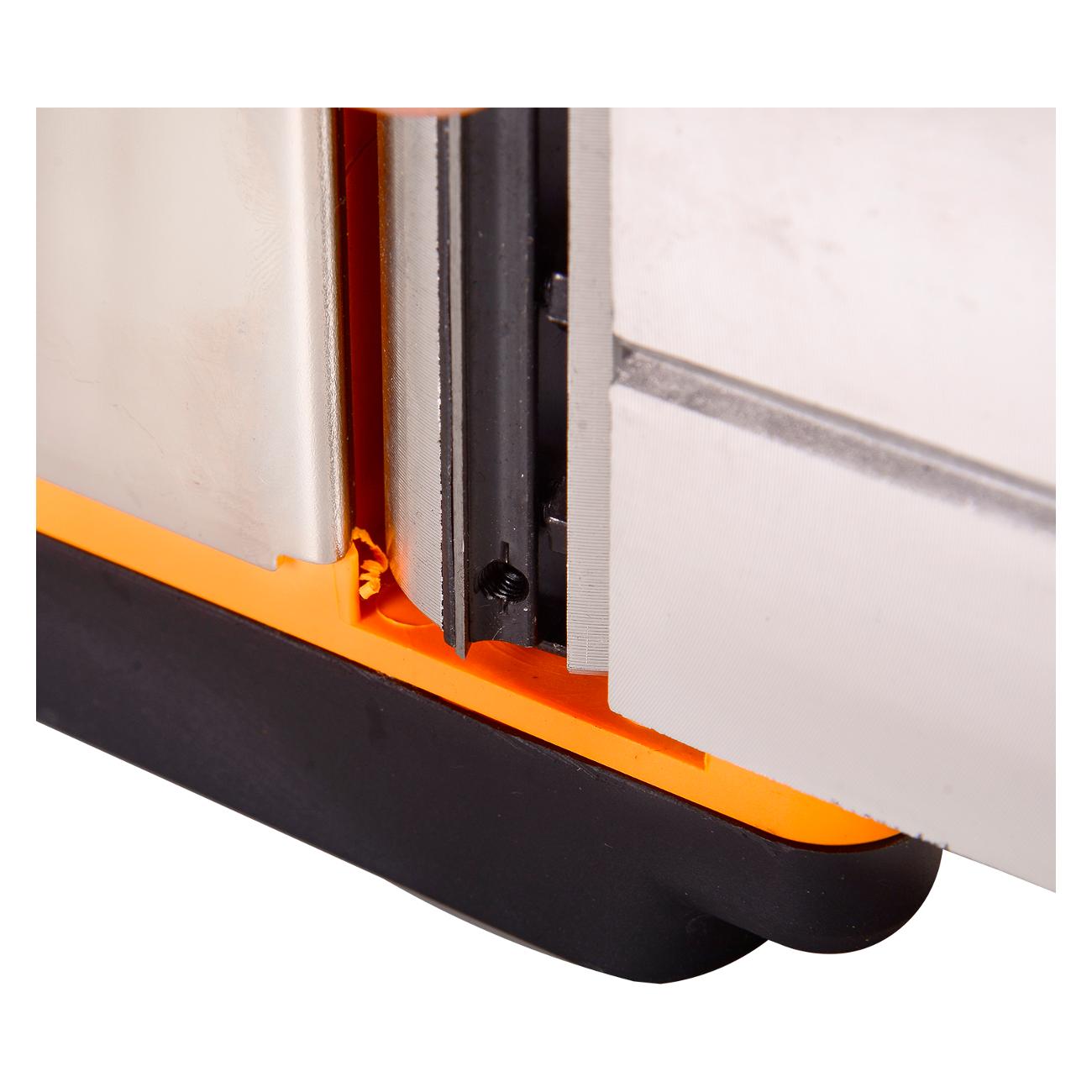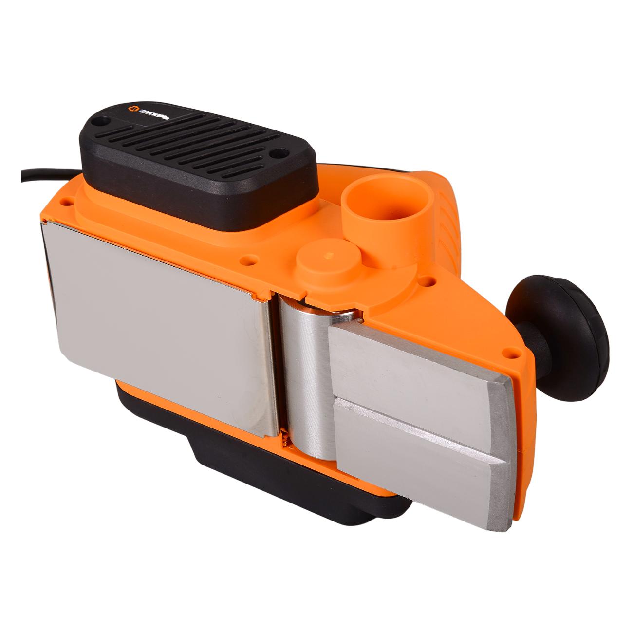 Рубанок обладает функцией регулировки глубины строгания от 0,25 до 2 мм. Реализована возможность механической блокировки кнопки включения. Устройство оснащается системой плавного запуска двигателя.