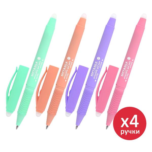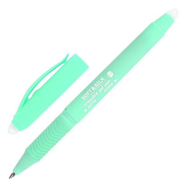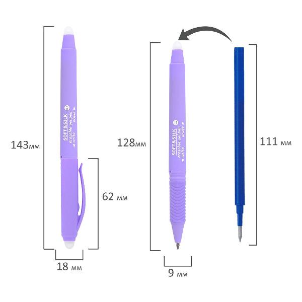 Ручка пишет специальными гелевыми чернилами синего цвета. Снабжена двумя ластиками для удаления надписей: на колпачке и на корпусе ручки. При письме и стирании ручка не повреждает бумагу, делая исправления незаметными. Диаметр пишущего узла 0,7 мм создает тонкую линию письма, равную 0,5 мм. Прорезиненный корпус для комфортного и длительного использования.