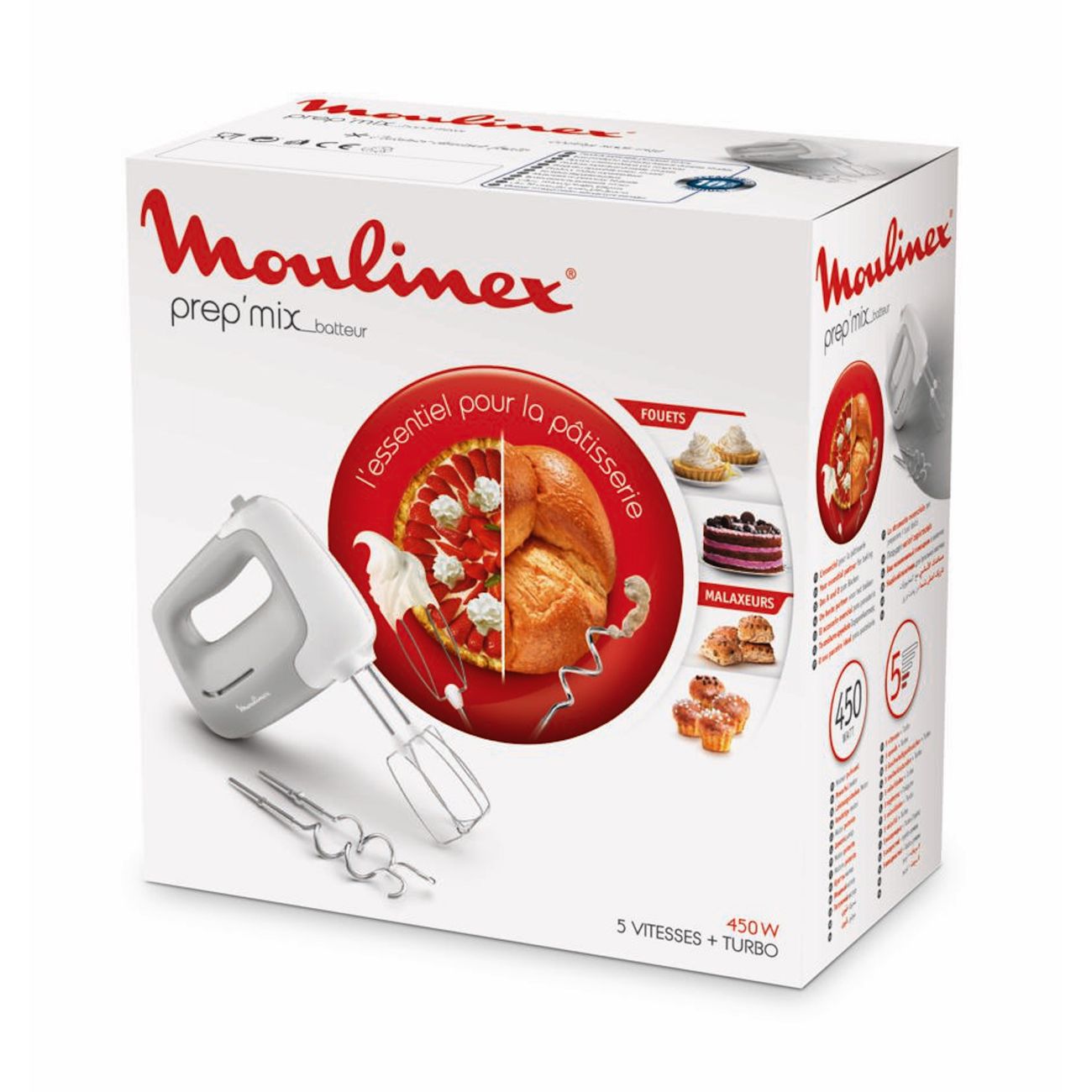 Ручной миксер HM450B10 от бренда Moulinex помогает сделать плотную пену из яичных белков, воздушные взбитые сливки, майонез с нежнейшей текстурой и многое другое. Прибор пригодится при приготовлении домашней выпечки, пиццы и хлеба. Вам доступны пять скоростных режимов и турбо-функция, включаемая отдельной кнопкой.