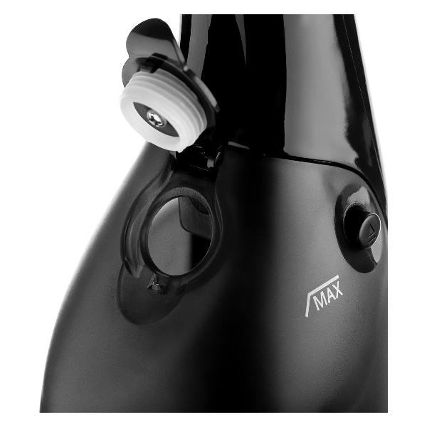 Объем емкости для воды составляет 250 мл, для удобства наполнения он снимается. Устройство готово к работе уже через 35 секунд после включения. Корпус отпаривателя выполнен из пластика, рабочая поверхность — из нержавеющей стали. Это прочный материал, устойчивый к механическим воздействиям и влаге. Шесть отверстий обеспечивают равномерность пароувлажнения.
