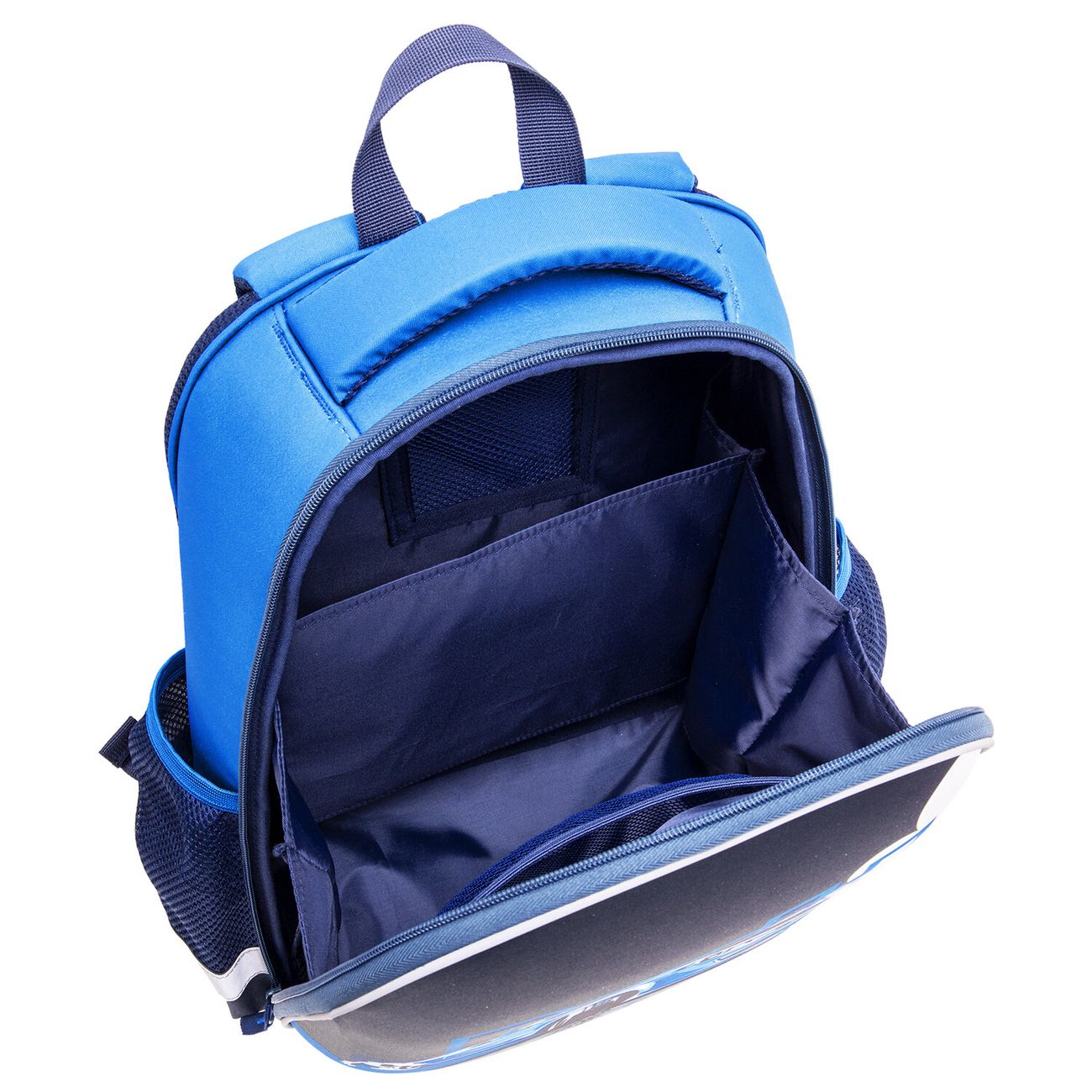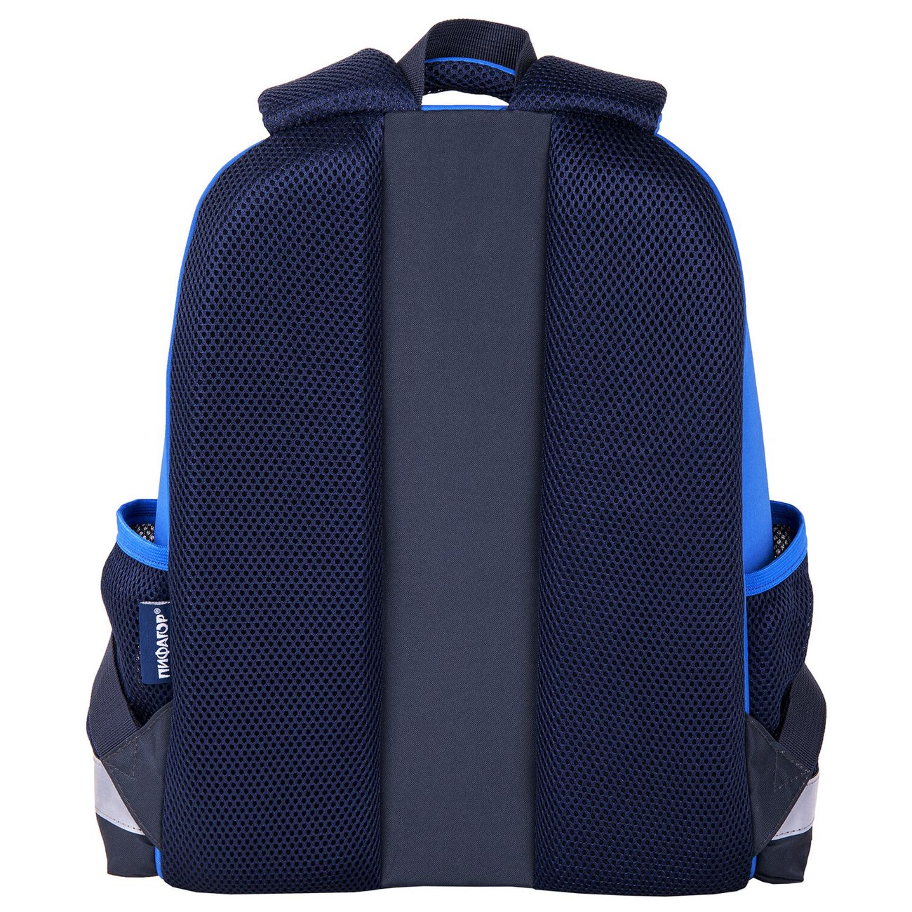 Детский школьный рюкзак «Пифагор» EVA Basic «Быстрый авто» — капсульная модель, изготовленная из формованного материала EVA. Внутри — одно отделение, оснащенное перегородкой, также есть два кармана и сетки по бокам. Молния реверсивная, с двумя бегунками — рюкзак удобно открывать даже одной рукой. Спинка сделана из спонжевых панелей анатомической формы, она хорошо сохраняет форму. И спинка, и лямки вентилируются. Дно выполнено из плотного полиуретана, не пропускающего влагу, и снабжено пластиковыми ножками. На рюкзак нанесены светоотражающие элементы. Размер рюкзака: 39 х 30 х 16 см, вес — 0,78 кг.