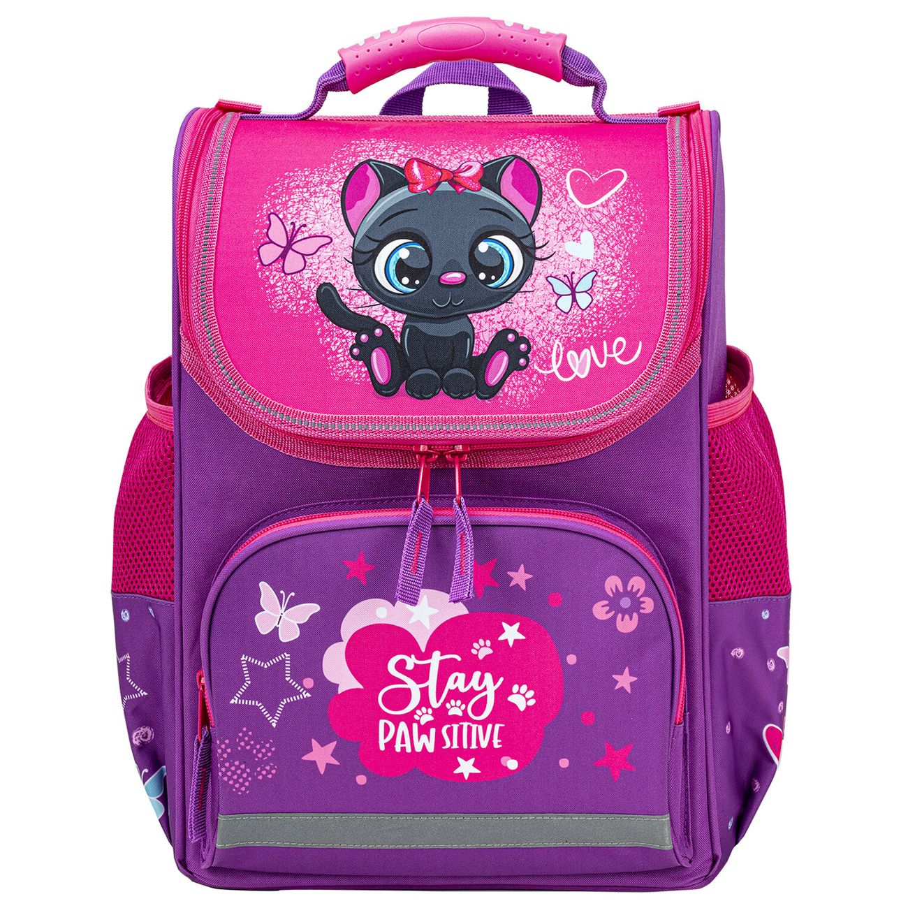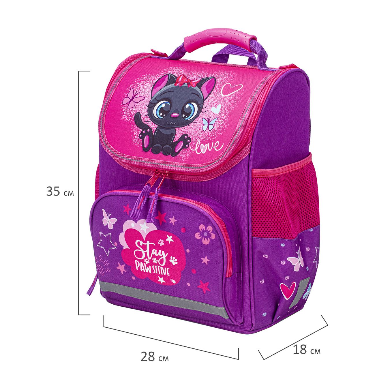 Детский школьный рюкзак «Пифагор» Basic «Черный котенок» оснащен одним внутренним отделением с перегородкой и тремя карманами, также есть внешний фронтальный карман и сетки по бокам. Основной отсек снабжен реверсивной молнией с двумя бегунками, крышка верхняя. С ее обратной стороны находится прозрачная вкладка с расписанием уроков. Спинка выполнена из спонжевых панелей и покрыта ячеистым материалом, что обеспечивает вентиляцию. Ремни S-образной формы тоже пропускают воздух. Рюкзак изготовлен из полиэстера плотностью 300D, дно — из водонепроницаемого полиуретана. На передний карман, торцы, лямки и крышку нанесены светоотражающие элементы. Размеры рюкзака: 35 х 28 х 18 см, вес — 0,95 кг.