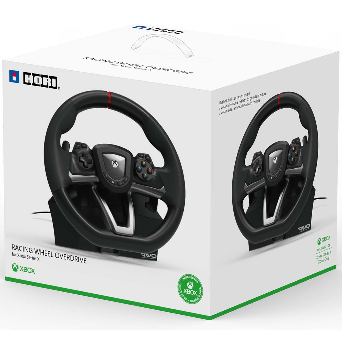 Руль Hori Overdrive, предназначенный для виртуальных игр, совместим с Xbox One, Xbox Series S, Xbox Series X. Он крепится к столу посредством прочных зажимов. Угол поворота составляет 270° с возможностью регулировки. Устройство дополнено ножными педалями и двумя подрулевыми переключателями передач.