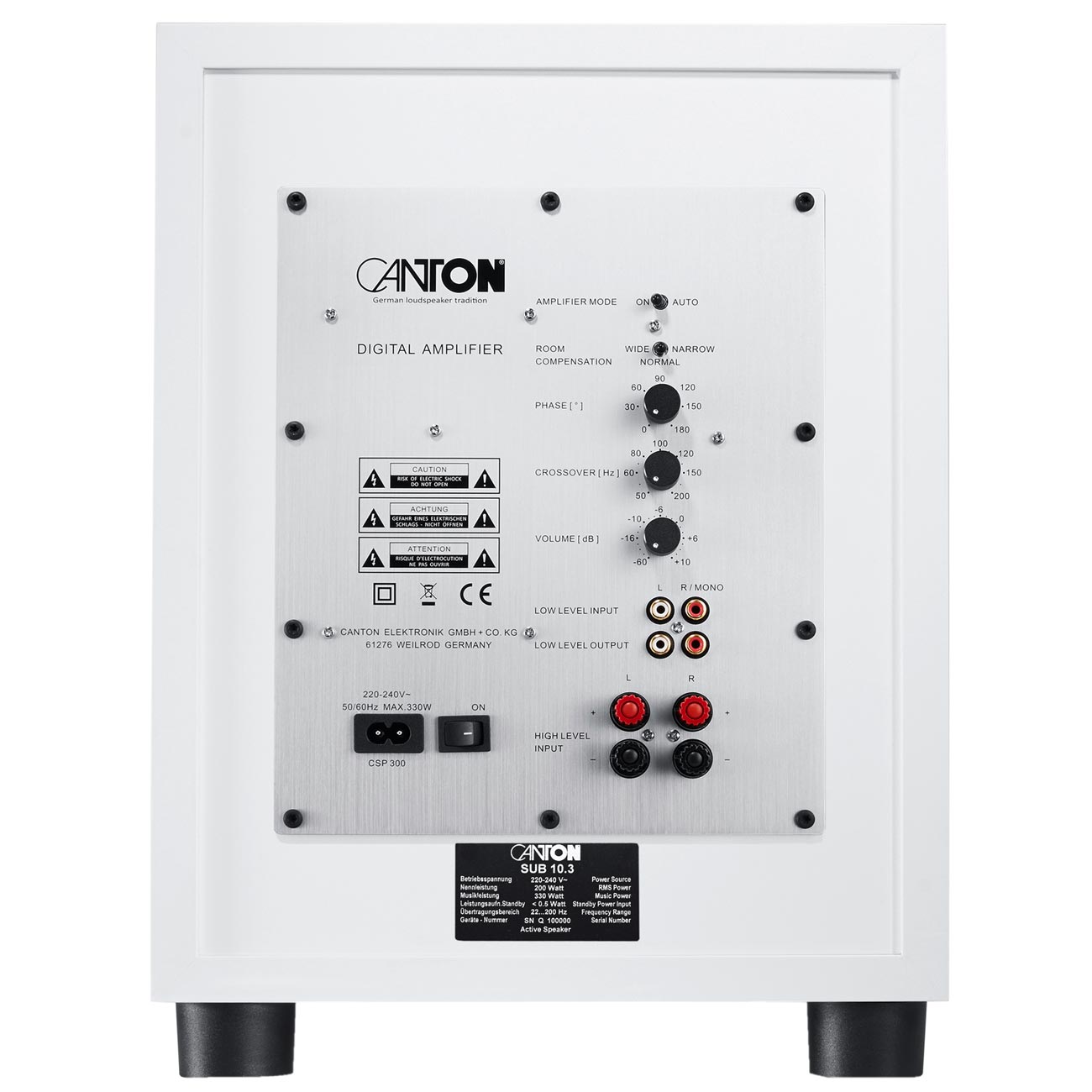Canton Sub 10.4 оборудован входами высокого и низкого уровня, с помощью которых его можно подключить к усилителю, AV-ресиверу, другой акустике и даже ещё одному сабвуферу для создания действительно мощной системы.