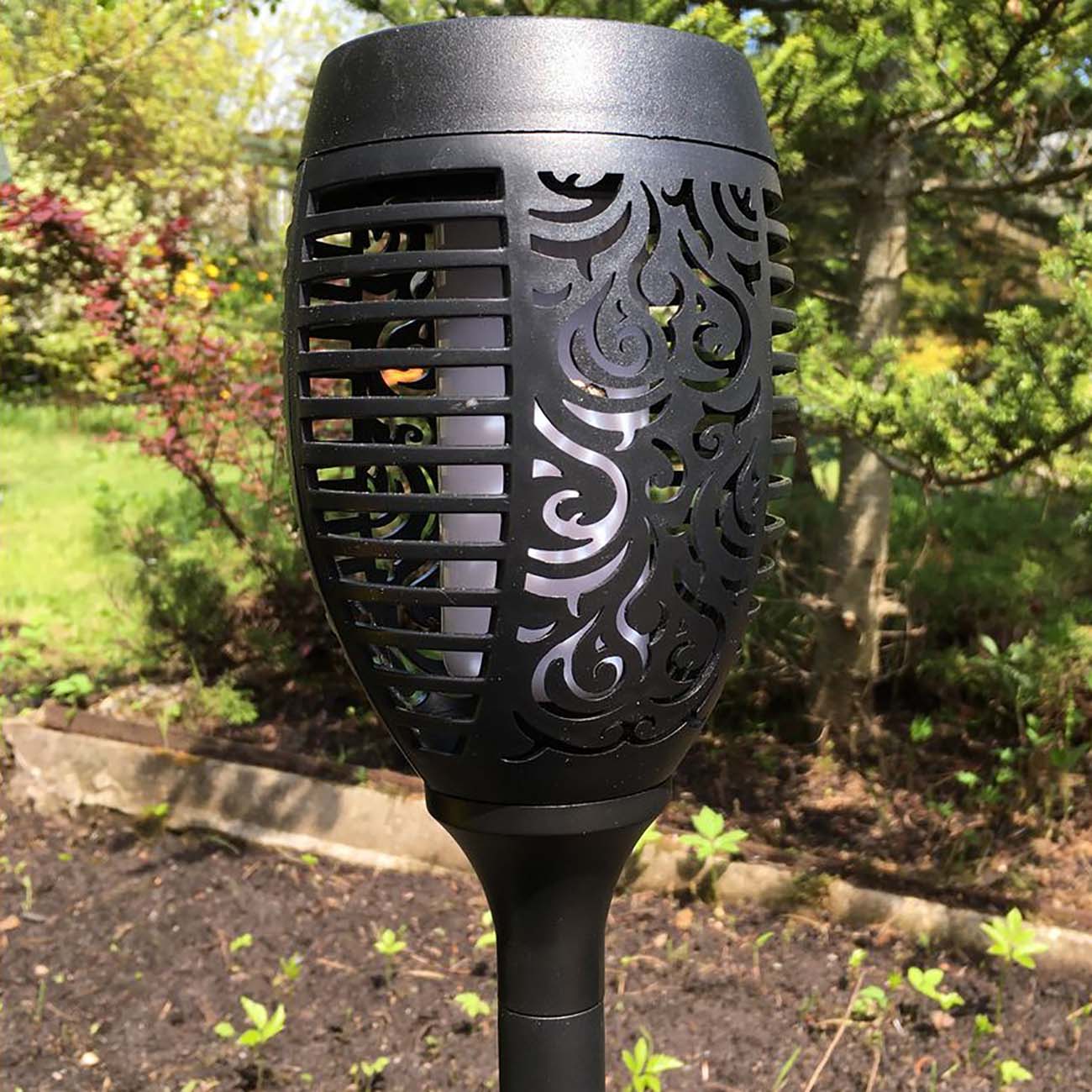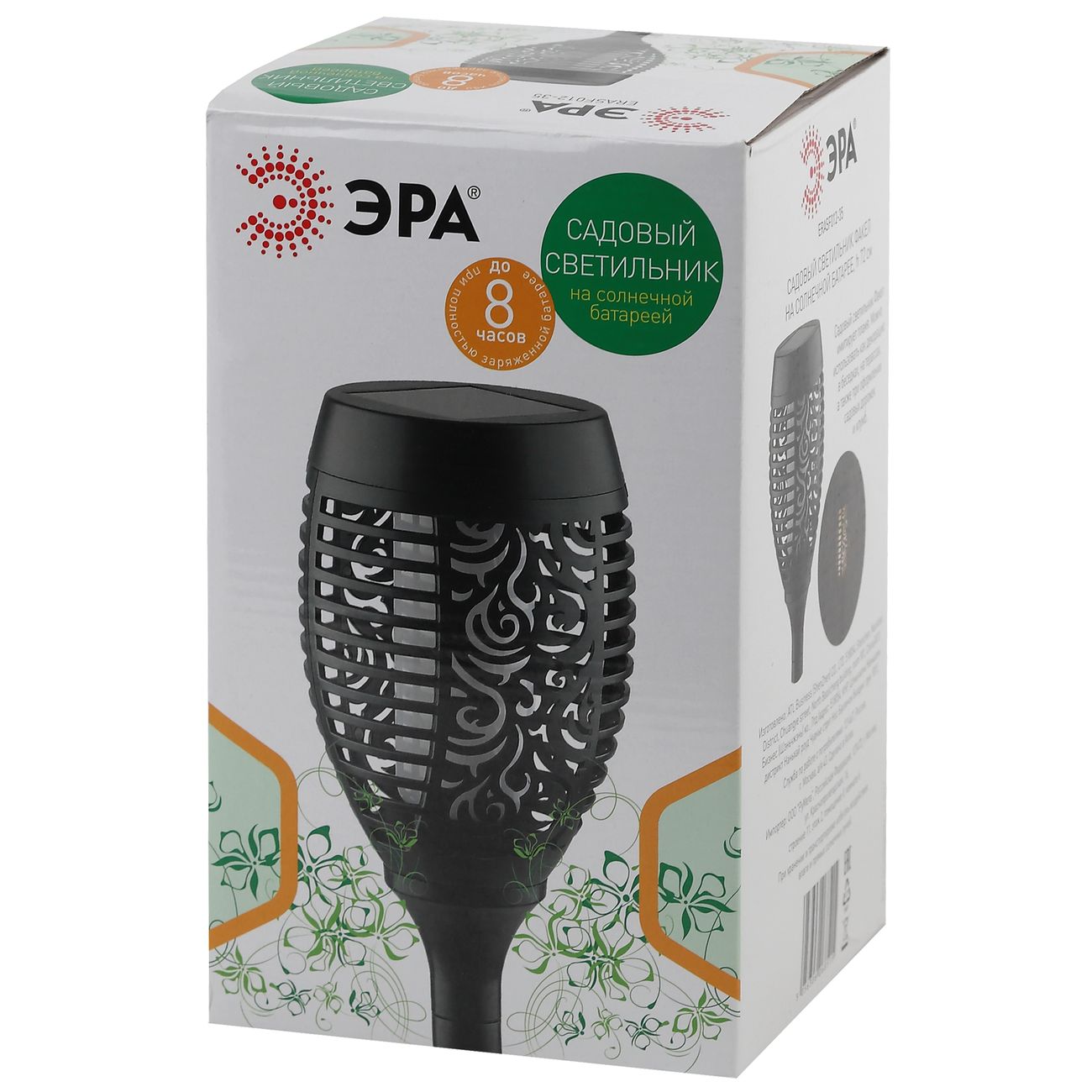 Садовый светильник «Эра» ERASF012-35 выполнен в форме факела. Он оборудован LED-лампой, питание получает от солнечной батареи (есть в комплекте). Ресурса хватает на 8 часов. Конструкция выполнена из пластика, устанавливается в землю. Высота модели — 22,5 см, вес — 420 г. За счет класса влаго- и пылезащиты IP44 светильник не боится дождя.