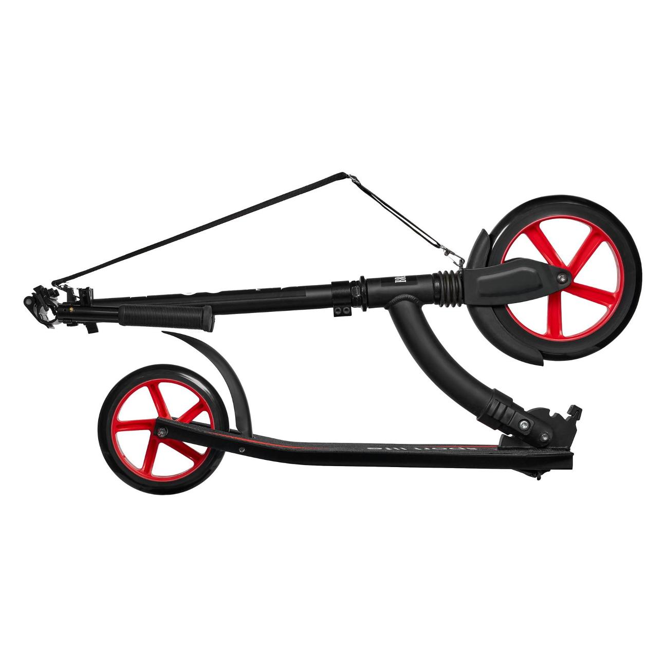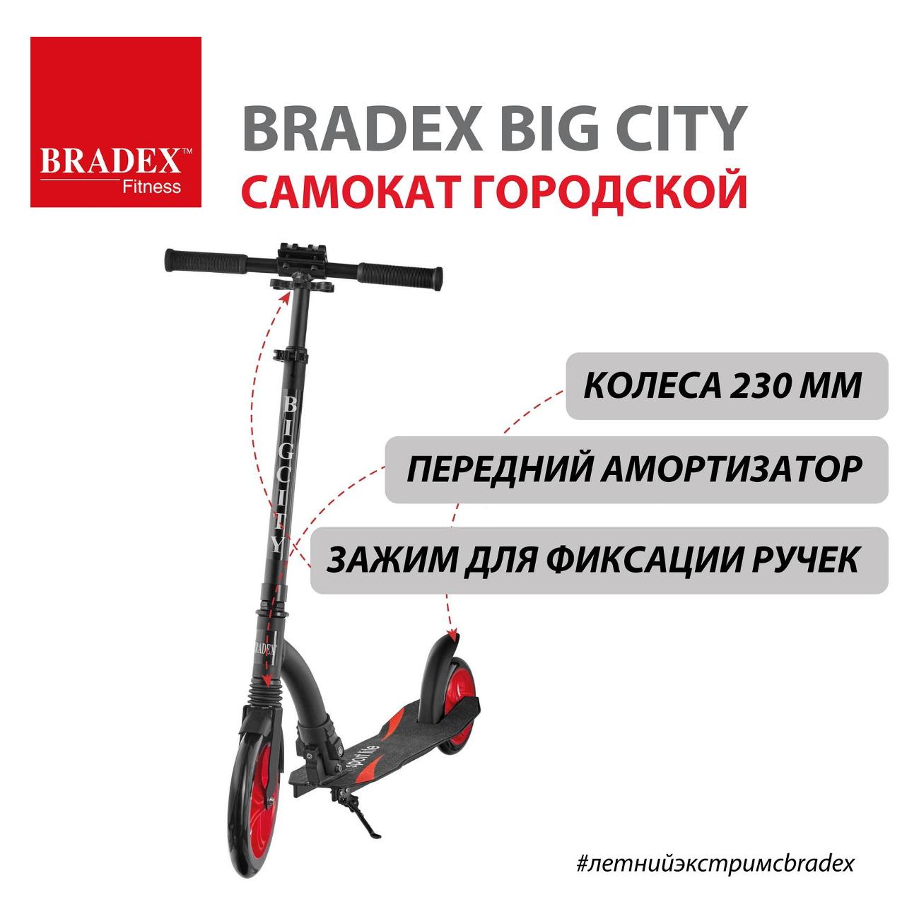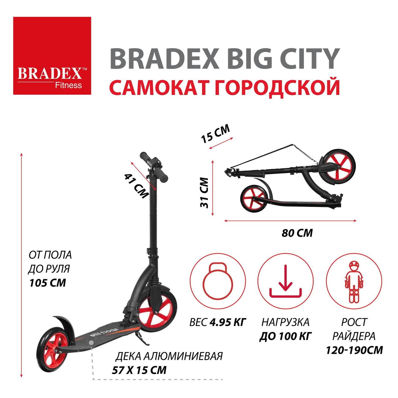 Самокат Bradex BIG CITY SF 0848 оснащен двумя колесами диаметром 18 см и 23 см из полиуретана, гарантирующего хорошее сцепление с дорогой и плавный ход. Подшипники ABEC-7 обеспечивают высокую скорость и маневренность самоката. Рама выполнена из алюминия. Эта модель рассчитана на нагрузку до 100 кг.