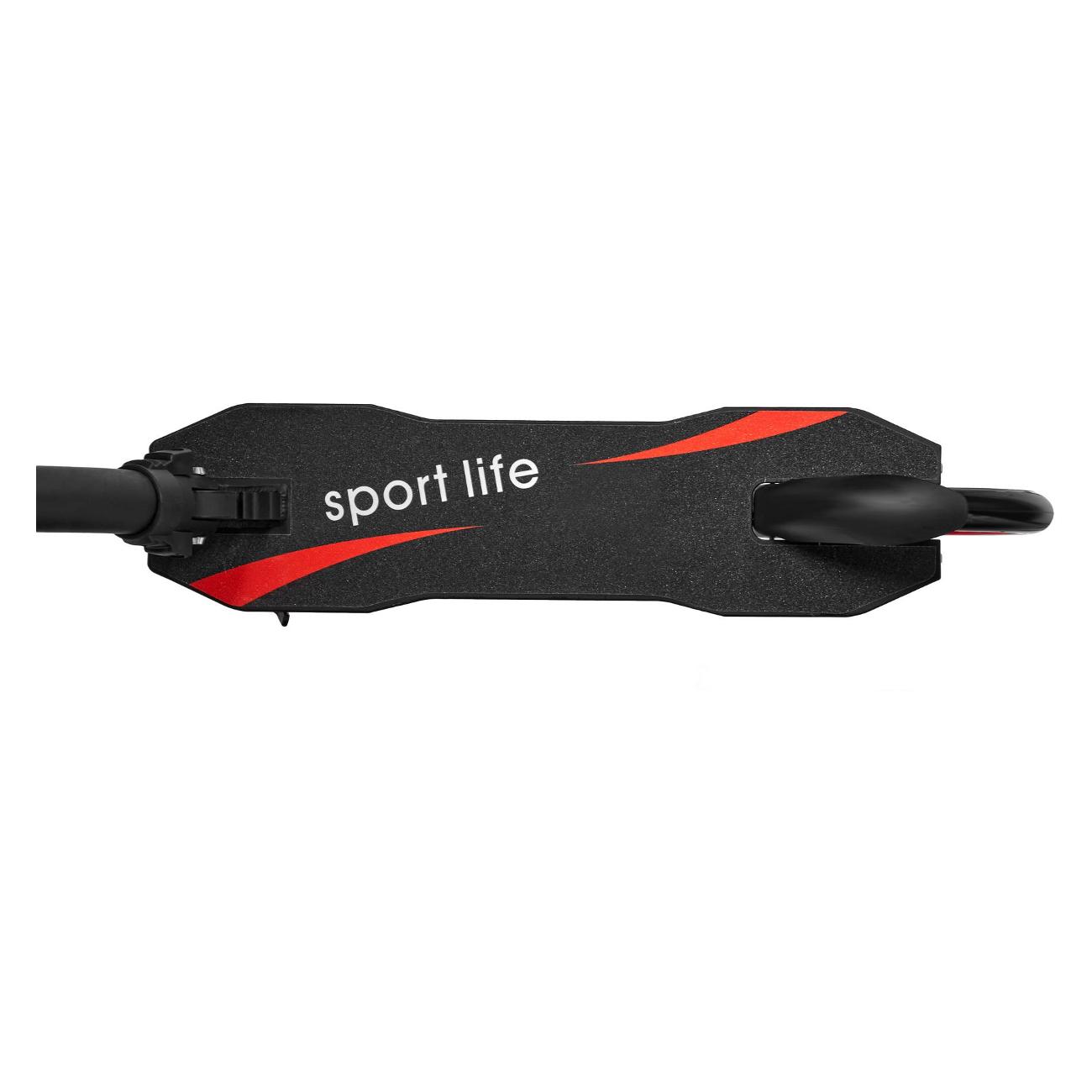 Подножка самоката снабжена антискользящим покрытием. Она обеспечивает устойчивость устройства во время парковки. Габариты модели — 15x10,5x96 см, вес — 5 кг.