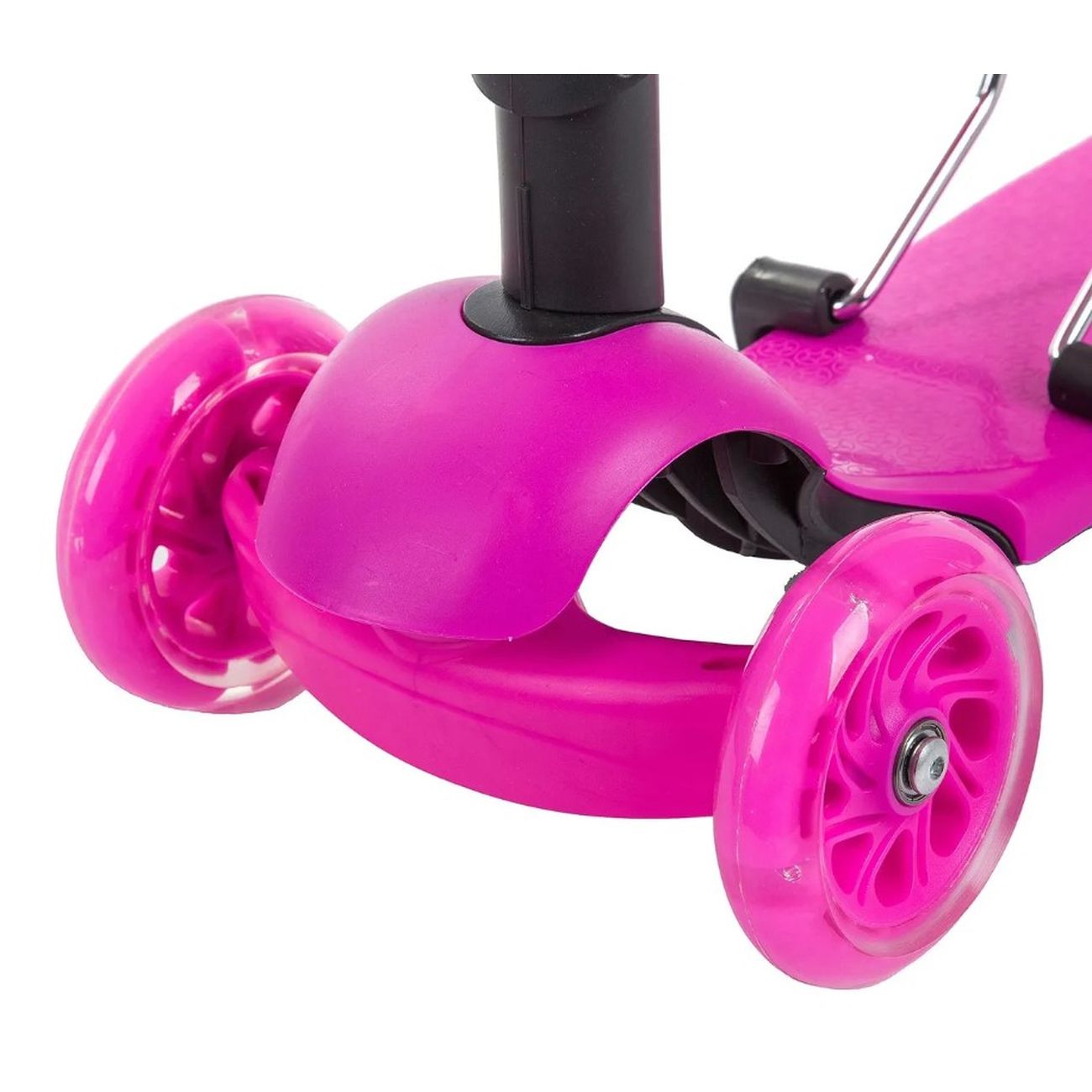 Самокат Novatrack Disco-Kids Saddle оснащен удобным сидением, сняв которое можно получить классический беговел для ребенка. Он оборудован тремя полиуретановыми колесами для большей устойчивости. На них установлены светодиоды, которые мигают разными цветами в процессе движения.
