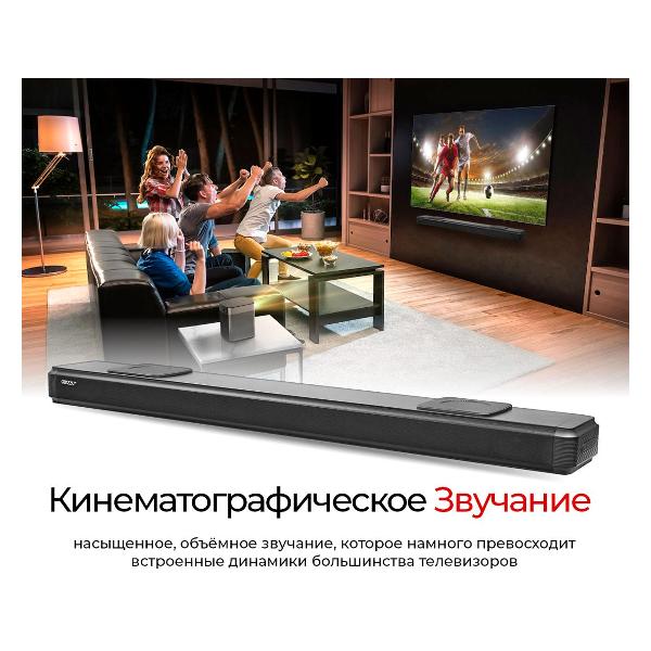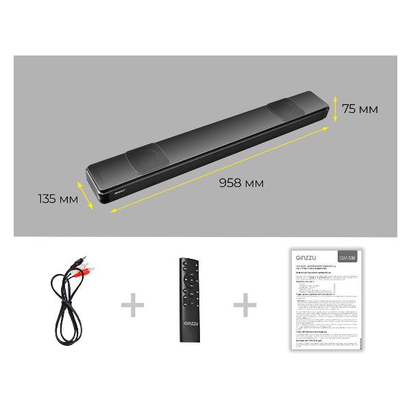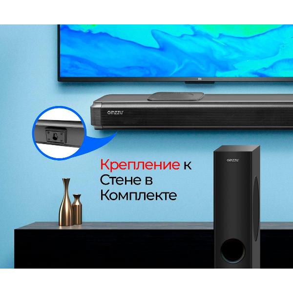На коммутационной панели Ginzzu GM-508 предусмотрены разъемы HDMI, оптический и линейный входы, USB-порт для подключения совместимых устройств и носителей информации. Корпус Ginzzu GM-508 весом 3,5 кг можно разместить рядом с телевизором или зафиксировать на стене (крепление в комплекте). Поддержка стандарта HDMI ARC позволяет управлять телевизором и саундбаром с помощью общего пульта. При отсутствии команд в течение 15 минут устройство переходит в спящий режим с пониженным энергопотреблением.