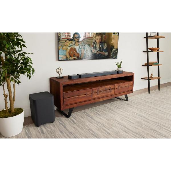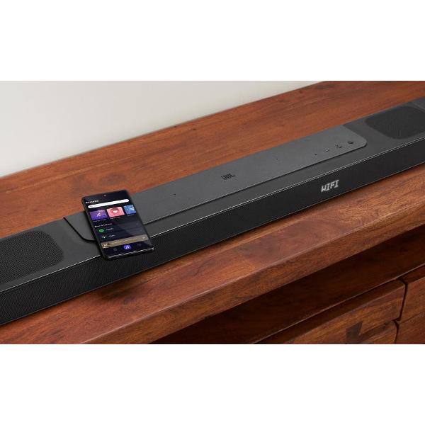 Саундбар JBL Bar 800 поставляется в комплекте с беспроводным сабвуфером мощностью 300 Вт, который представлен в корпусе из пластика. Размер равен 44x30,5x30,5 см. Передача данных осуществляется посредством встроенных модулей Bluetooth и Wi-Fi. Можно использовать телефон в качестве пульта дистанционного управления. Модель оборудована входом и выходом HDMI. Предназначена для настенного монтажа. Показатель потребляемой мощности саундбара не превышает 220 Вт. Устройство оснащено декодерами Dolby Atmos и Dolby Digital, которые улучшают качество звука.