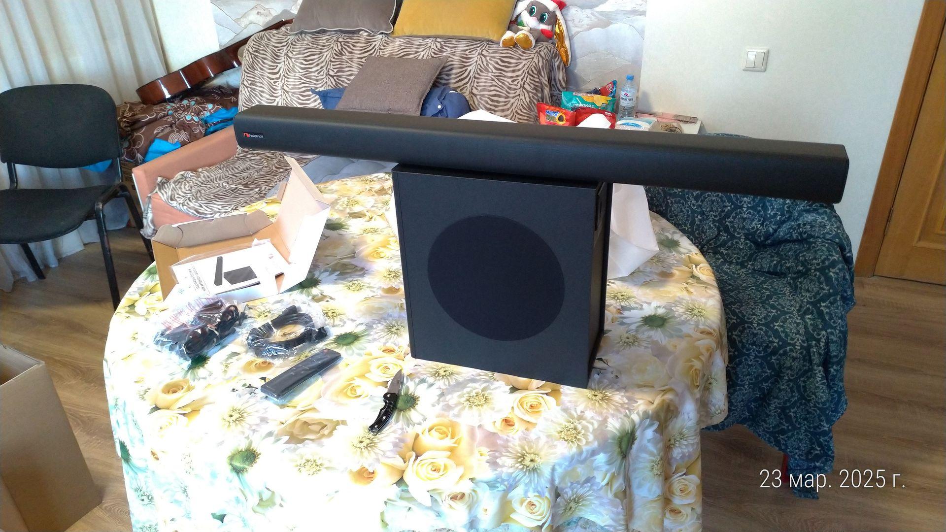 Стильный внешний вид, качественная сборка, регулировка подсветки с информацией режима подключения и громкости. Множество режимов подключения: USB, BT, HDMI, Line, Coaxial, Opt. Управление через смартфон и ик-пульт в комплекте. Звук приятный, не бренчит, не свистит, самое то для небольшой комнаты, нас вполне устраивает, просмотр фильмов и музыки стал на много интереснее. Саб подключается по беспроводному подключению, что тоже удобно, не нужны лишние провода! Есть кнонопки управления на правом торце саундбара, в управлении всё просто, удобно, интуитивно. Возможно крепление к стене. Простое подключение, шнуры HDMI и 3,5 джек, батарейки в комплекте.