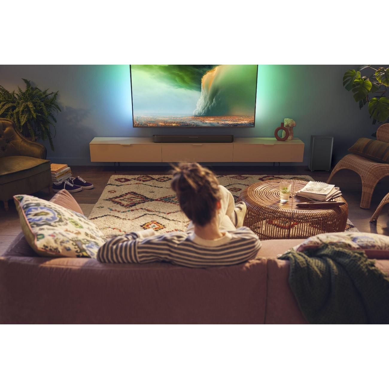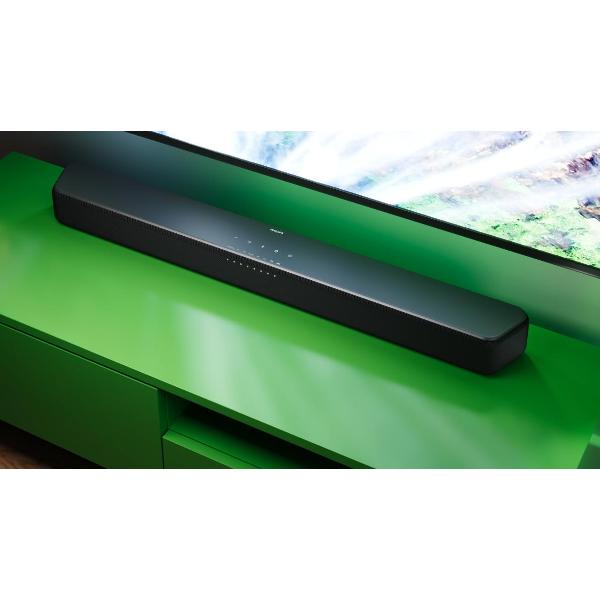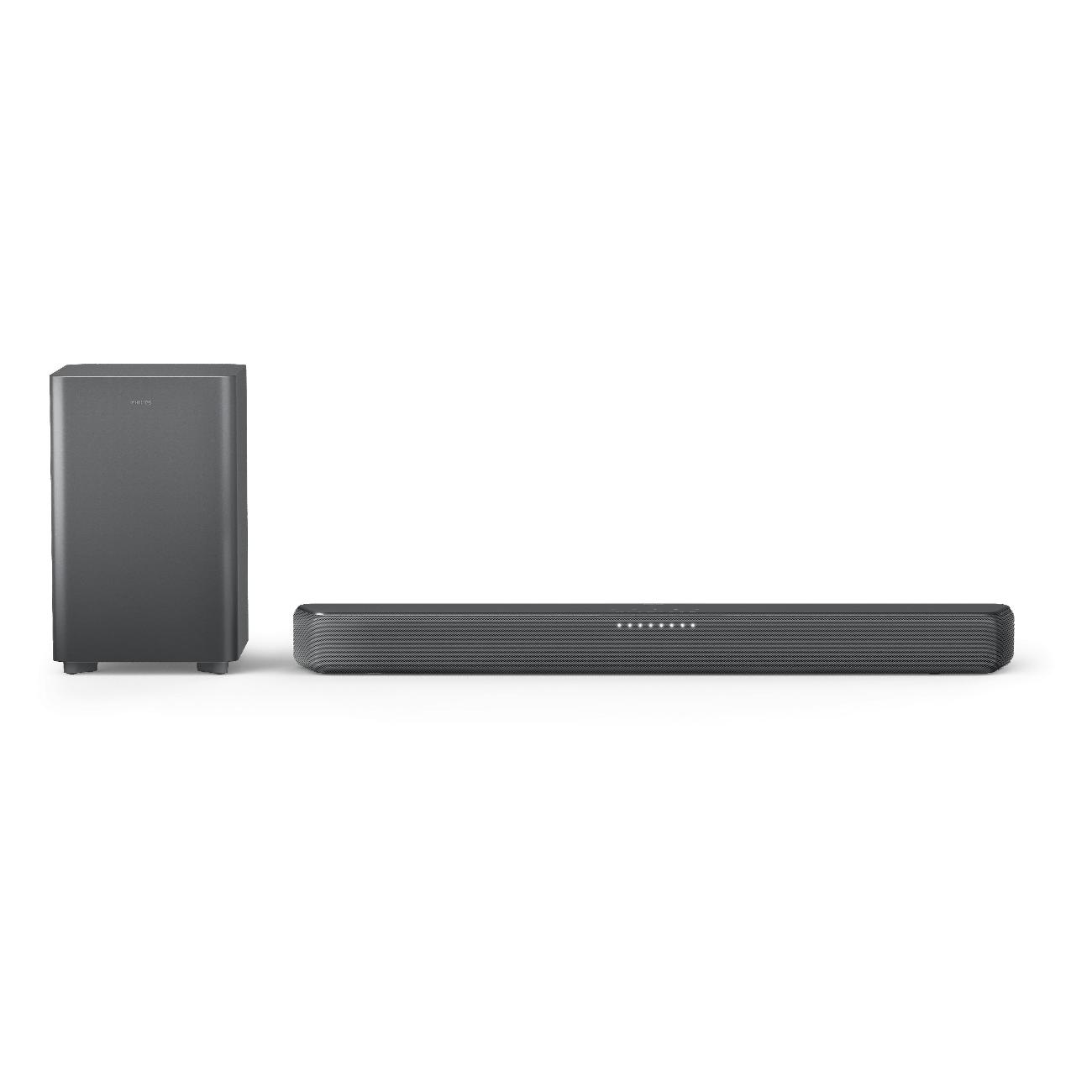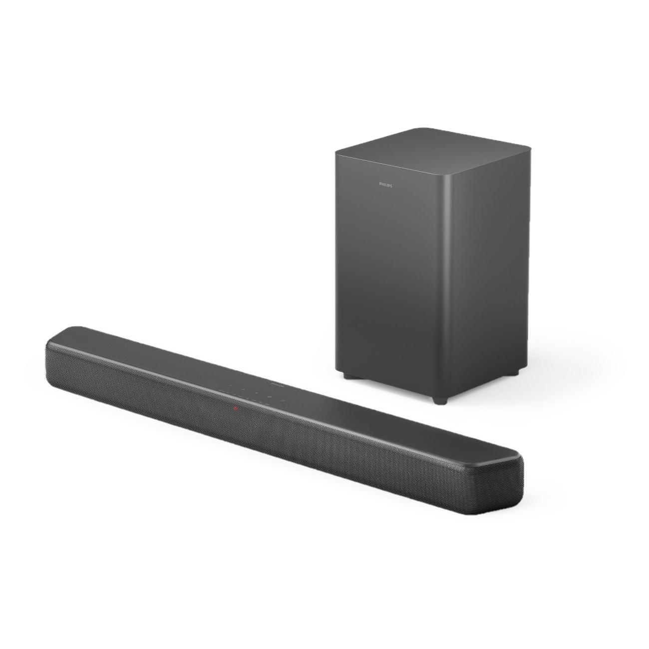 Саундбар Philips TAB5309/10 состоит из основного устройства и беспроводного активного сабвуфера (система 2.1) и выдает глубокий и богатый нюансами звук суммарной мощностью 240 Вт, который порадует и киноманов, и меломанов, и геймеров.