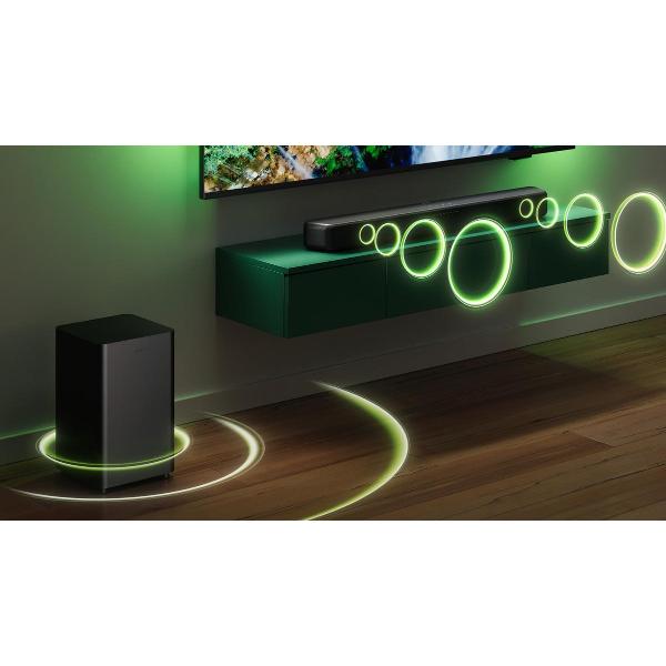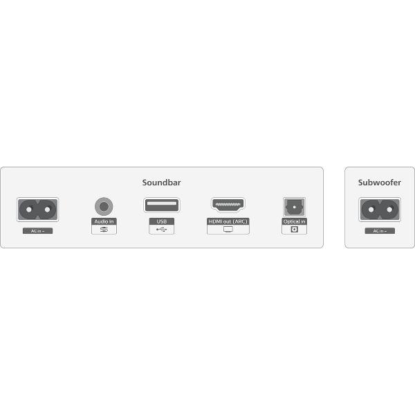 Для подключения саундбар оснащен входом и выходом HDMI и 3,5-миллиметровым разъемом. Кроме того, интегрирован порт USB — можно воспроизводить музыку с внешних накопителей, поддерживаются популярные форматы MP3, WAV, FLAC.