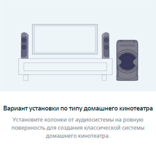 Систему правильнее установить в комбинации с телевизором по обеим сторонам или под ним. Так система звучит наилучшим образом.