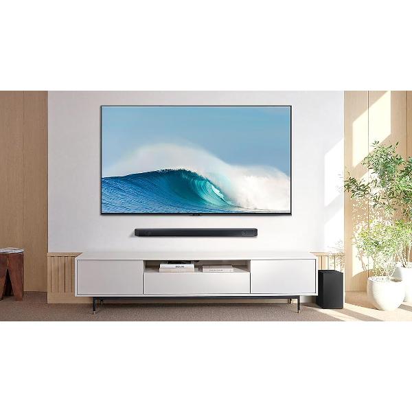 Сабвуфер подключается к системе по беспроводной связи, поэтому устройство можно установить в любом конце комнаты.