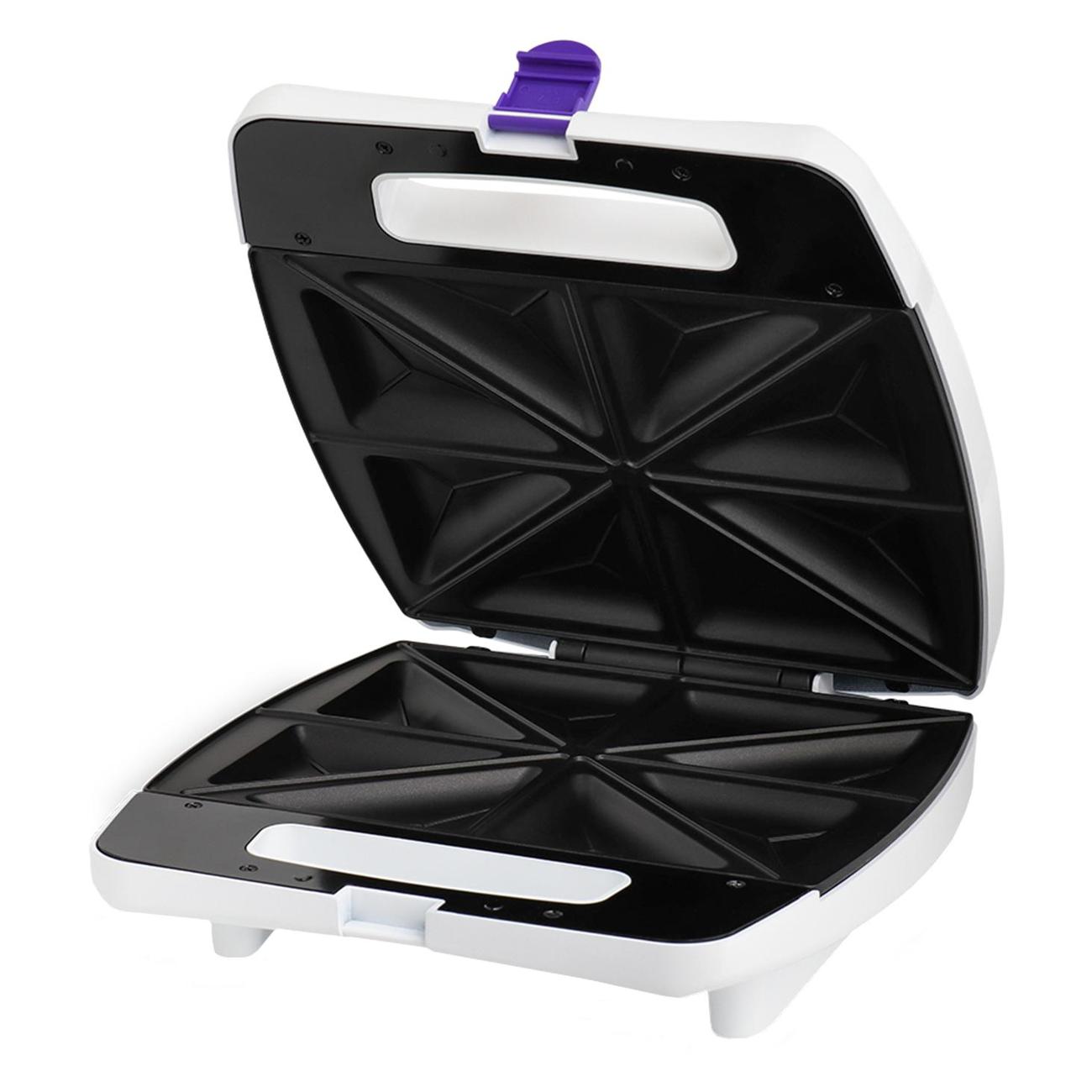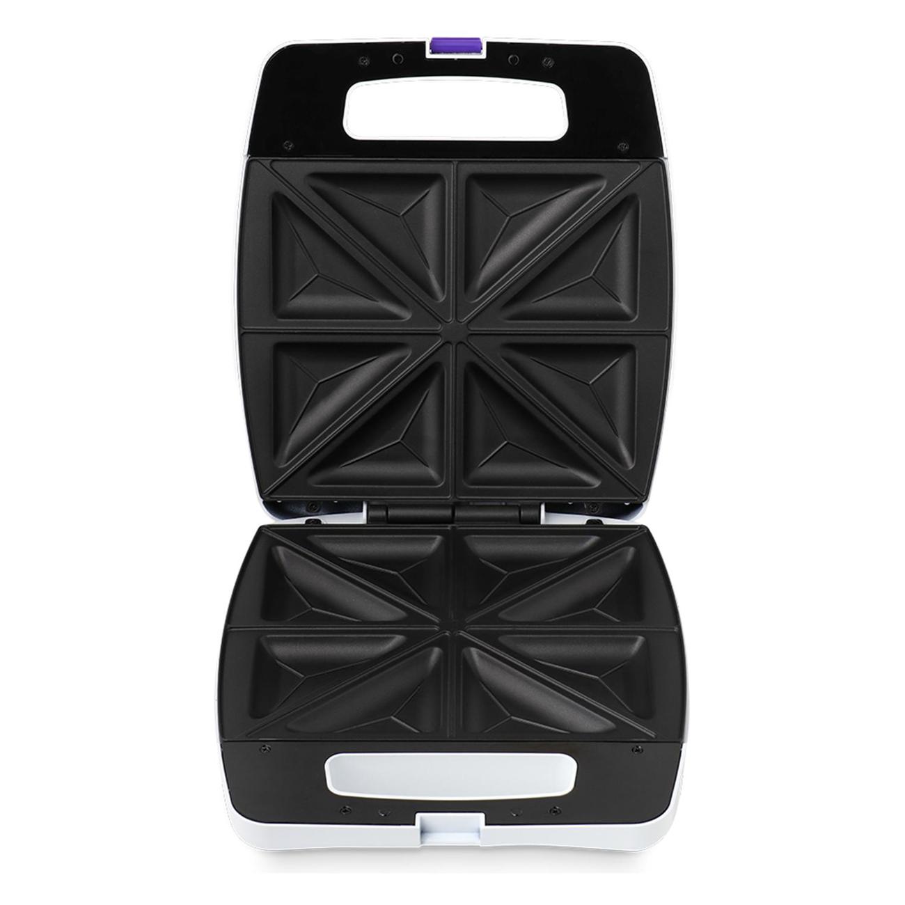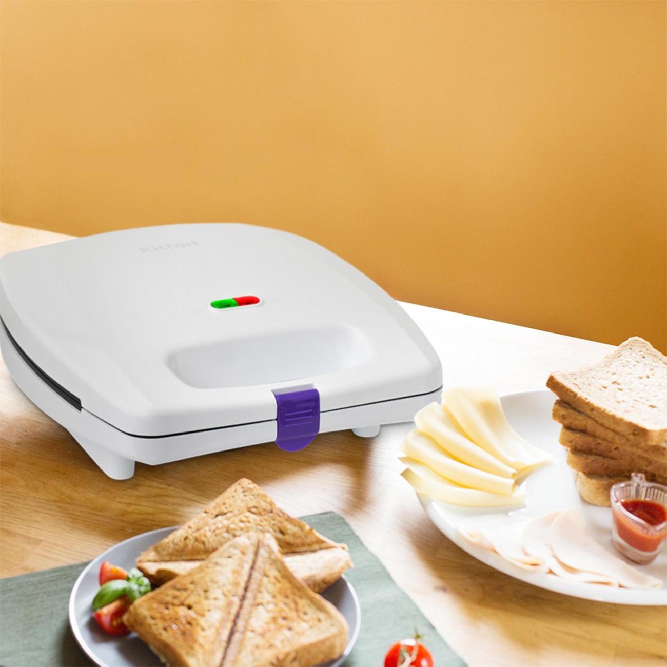 Сэндвичница Kitfort КТ-1669 мощностью 1400 Вт позволяет одновременно приготовить восемь треугольных бутербродов — это четыре порции. Размеры панелей — 265х210 мм. Управление очень простое: вводить настройки не требуется. Достаточно лишь включить прибор и дождаться нагрева, заложить бутерброды и ждать окончания приготовления.