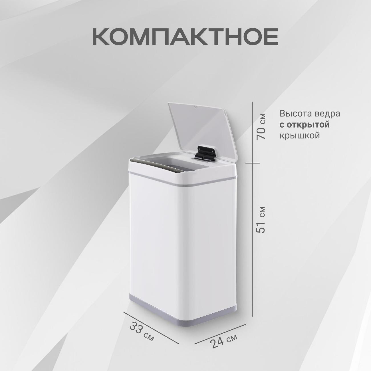 Сенсорная технология оказалась очень удобной, если поднести руку, то крышка автоматически открывается плавным движением. Когда заняты руки, то эта функция прям спасение. Ведро по размеру идеально подошло, оно и не громоздкое, но и не маленькое, для семьи из 4 человек хватает. Дизайн минималистичный привлек наше внимание и мы не ошиблись, под нашу кухню суперски подошло. Спасибо продавцу!