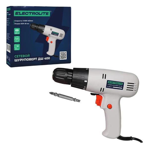 Дрель электрическая серого цвета с черными элементами Electrolite ДШ-400 обладает массой 1800 г. Уровень мощности не превышает 400 Вт. Длина кабеля питания составляет 200 см. В комплекте поставляются угольные щетки. Максимальная скорость редуктора — до 800 об/мин. Крутящий момент достигает 30 Н.м. Используется двигатель щеточного типа. Инструмент относится к бытовому классу.