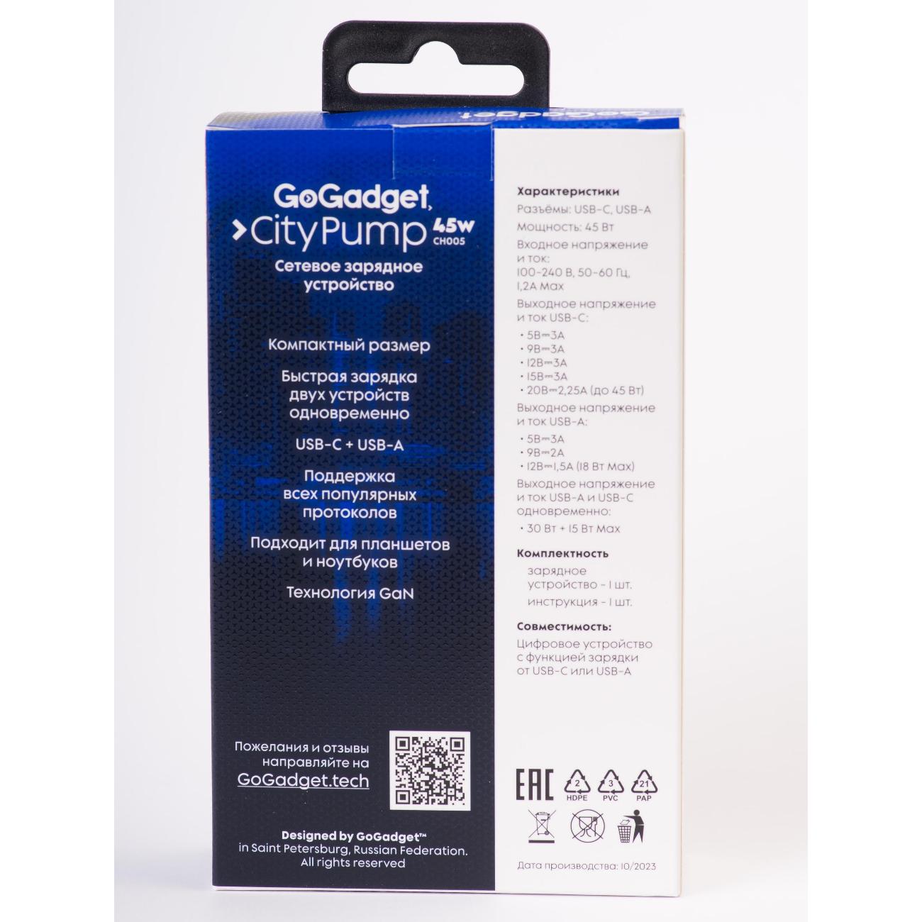 Вы можете купить Сетевое зарядное устройство GoGadget CityPump 45W (CH005) в магазинах М.Видео по доступной цене. Сетевое зарядное устройство GoGadget CityPump 45W (CH005): подробное описание, фото и отзывы реальных покупателей, характеристики, возможность скачать инструкции и подобрать аксессуары.