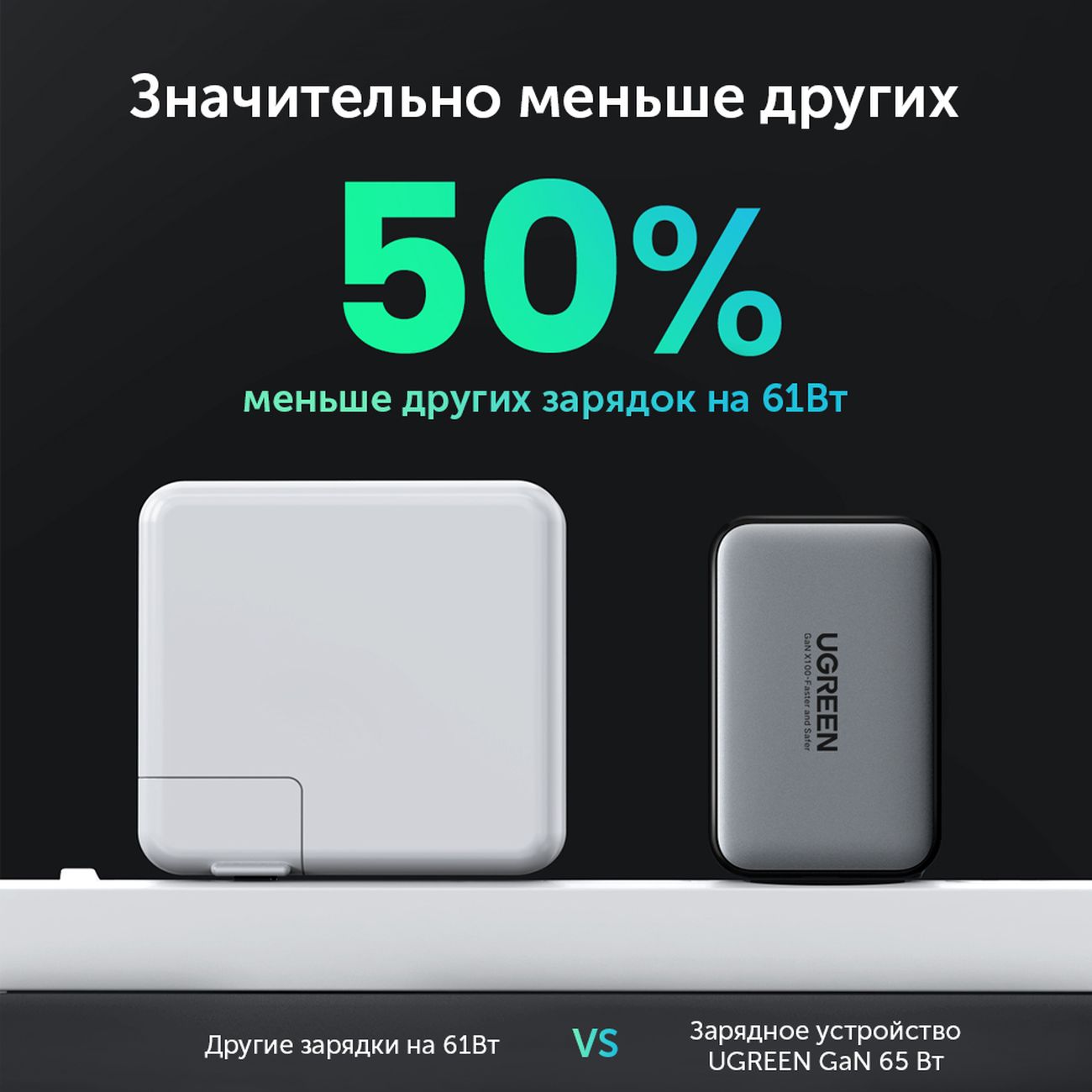 Сетевое зарядное устройство uGreen 10335 65 Вт с функцией быстрой зарядки позволяет заряжать 3 гаджета одновременно. Конструкция оснащена разъемами типа USB-C (2 шт.) и одним USB-A. Подходит для Switch, iPhone 12 и более новых моделей, а также Galaxy S22/S21/S20, Xiaomi Redmi Note 11 и последующих версий.