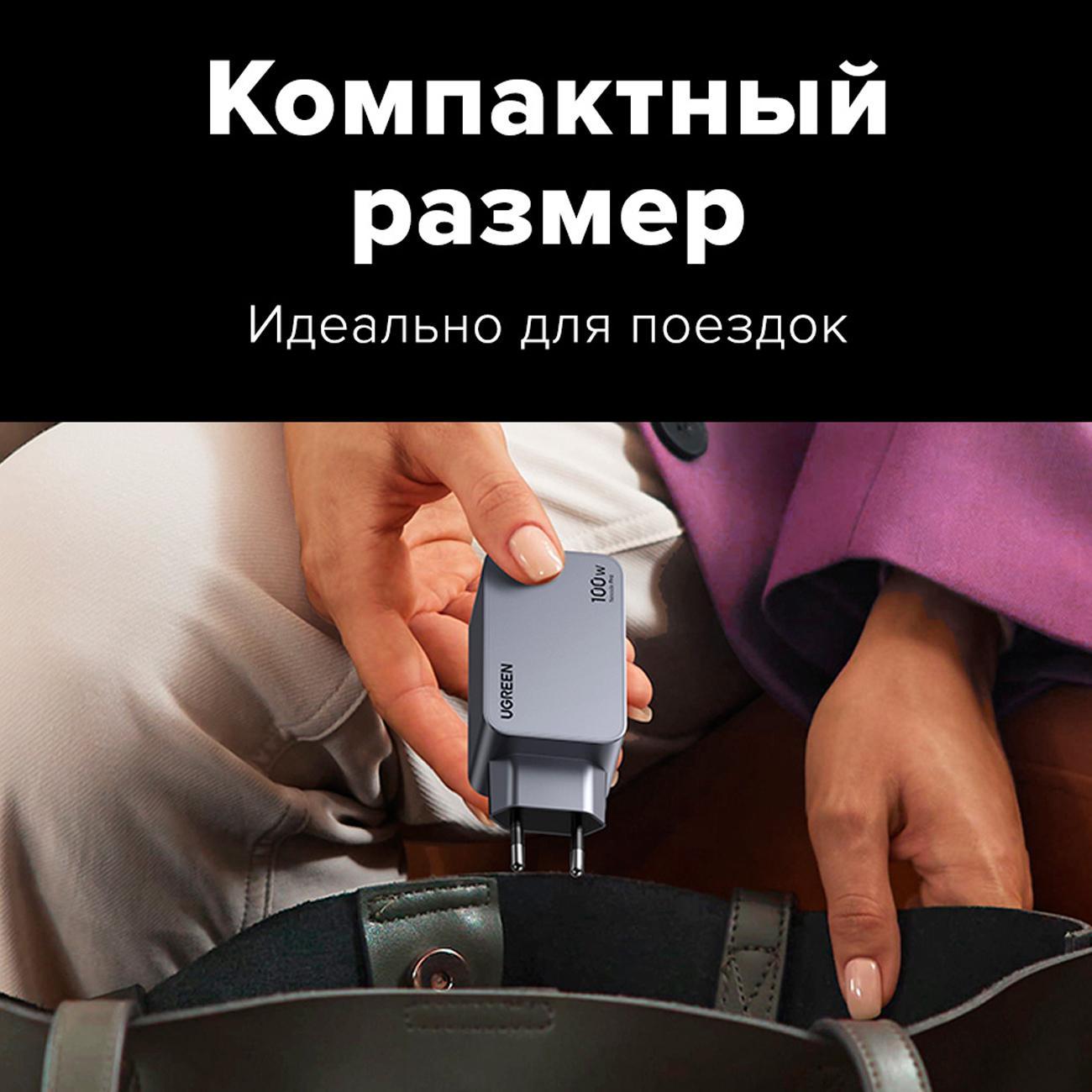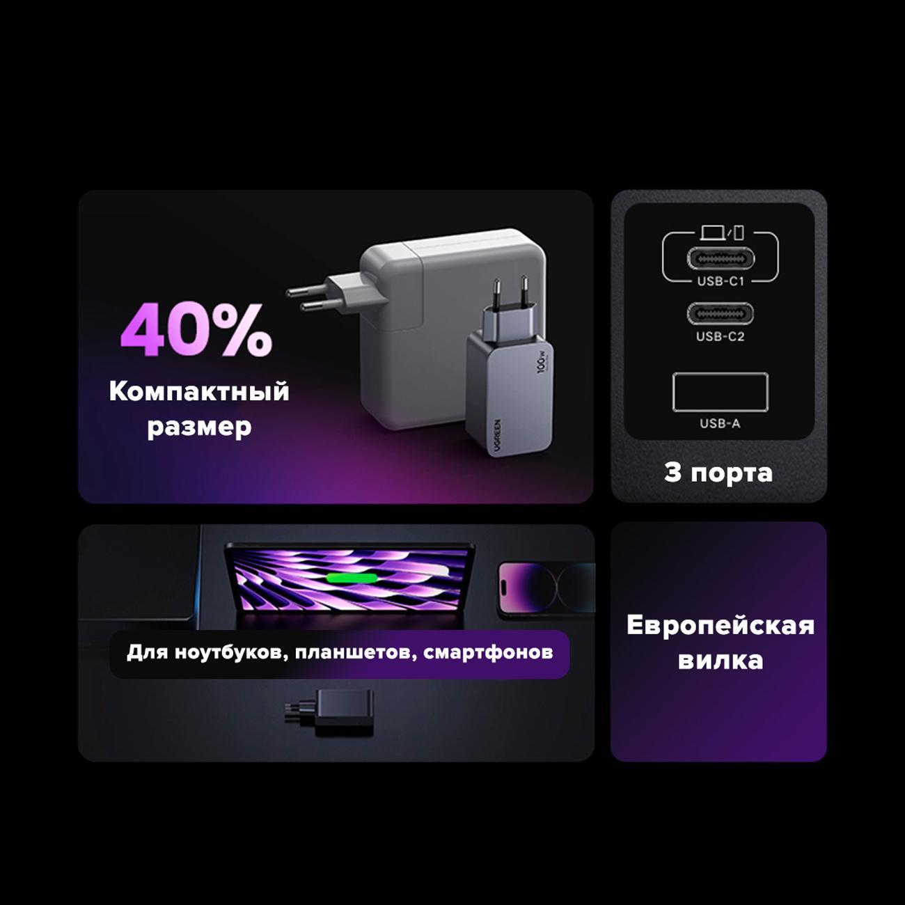 Наверное самая компактная зарядка на 100 Вт. Мощность достаточна для питания практически любых ноутбуков (для тех, которые не умеют кормиться по Type-C, есть триггеры)., что позволяет таскать с собой только одну зарядку. Три порта позволяют одновременно заряжать соответственно 3 устройства, причём один из них может быть ноутбуком (правда, не самым мощным или выключенным). Владельцы китайских смартфонов и планшетов (Oppo, Realme, Xiaomi и прочие) могут конечно расстроиться, что их фирменная быстрая зарядка в многие десятки или даже сотню ватт не поддерживается, но это вина производителей телефонов, выдумывающих собственные стандарты зарядки вместо использования PD 3.0, поверх которого можно сделать любой такой протокол зарядки, так что это не минусы этого uGreen. Но стандартные протоколы от Qualcomm и MediaTek поддерживаются, так что не всё так печально, мне хватает. Но предупредить нужно: если на вашем телефоне фирменная зарядка какая-нибудь SuperDart, SuperVooc, Hypercharge на 60/90/120 ватт, от этой зарядки будет максимум 12 или 22,5 ватта.