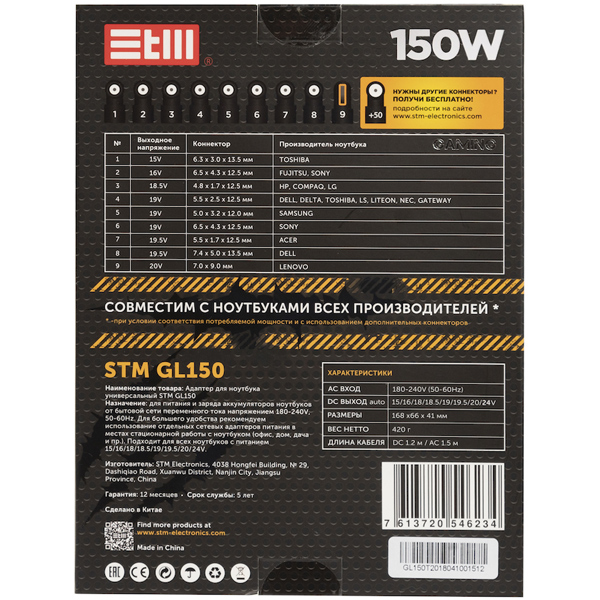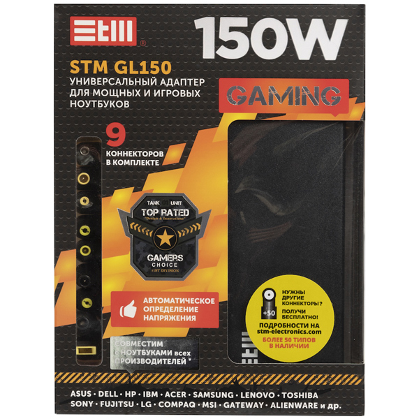 Сетевой адаптер для ноутбуков STM GL150 подойдёт для подключения к питанию устройств любых конфигураций и брендов. Он поставляется с набором из девяти съёмных штекеров, которые можно хранить на удобной подставке.