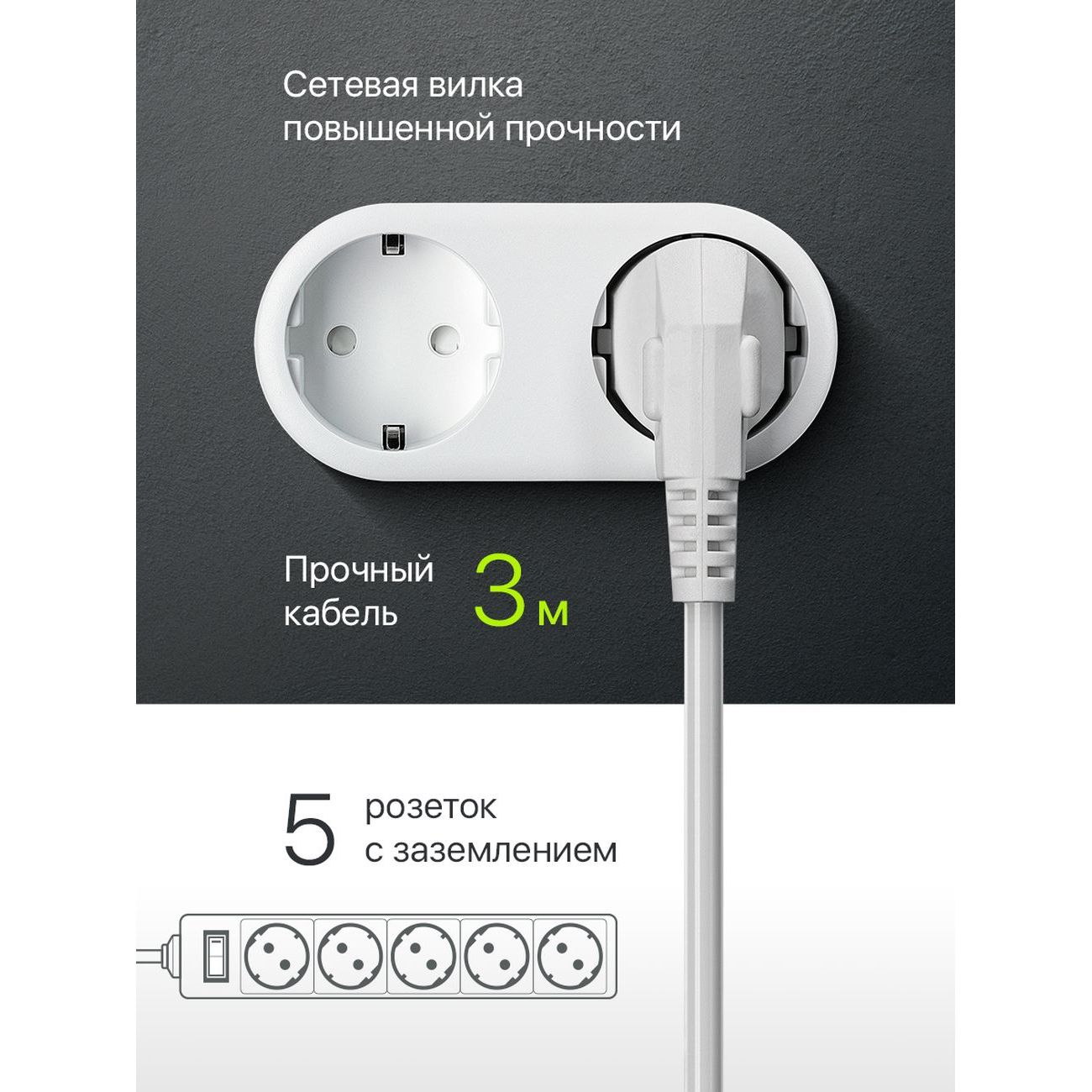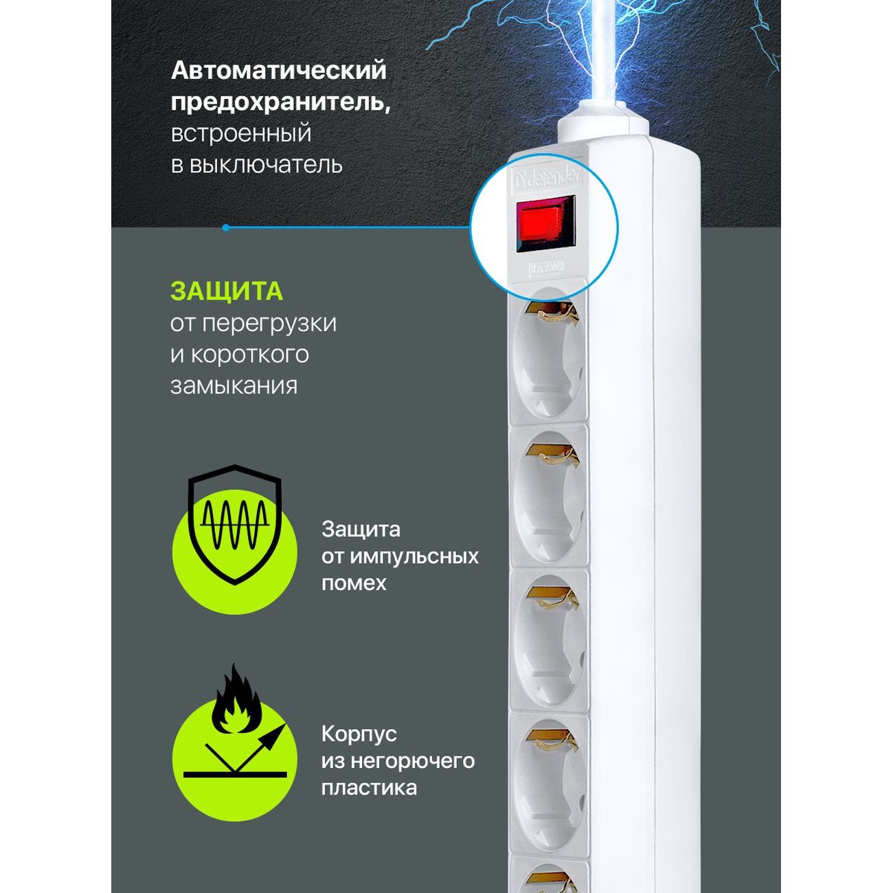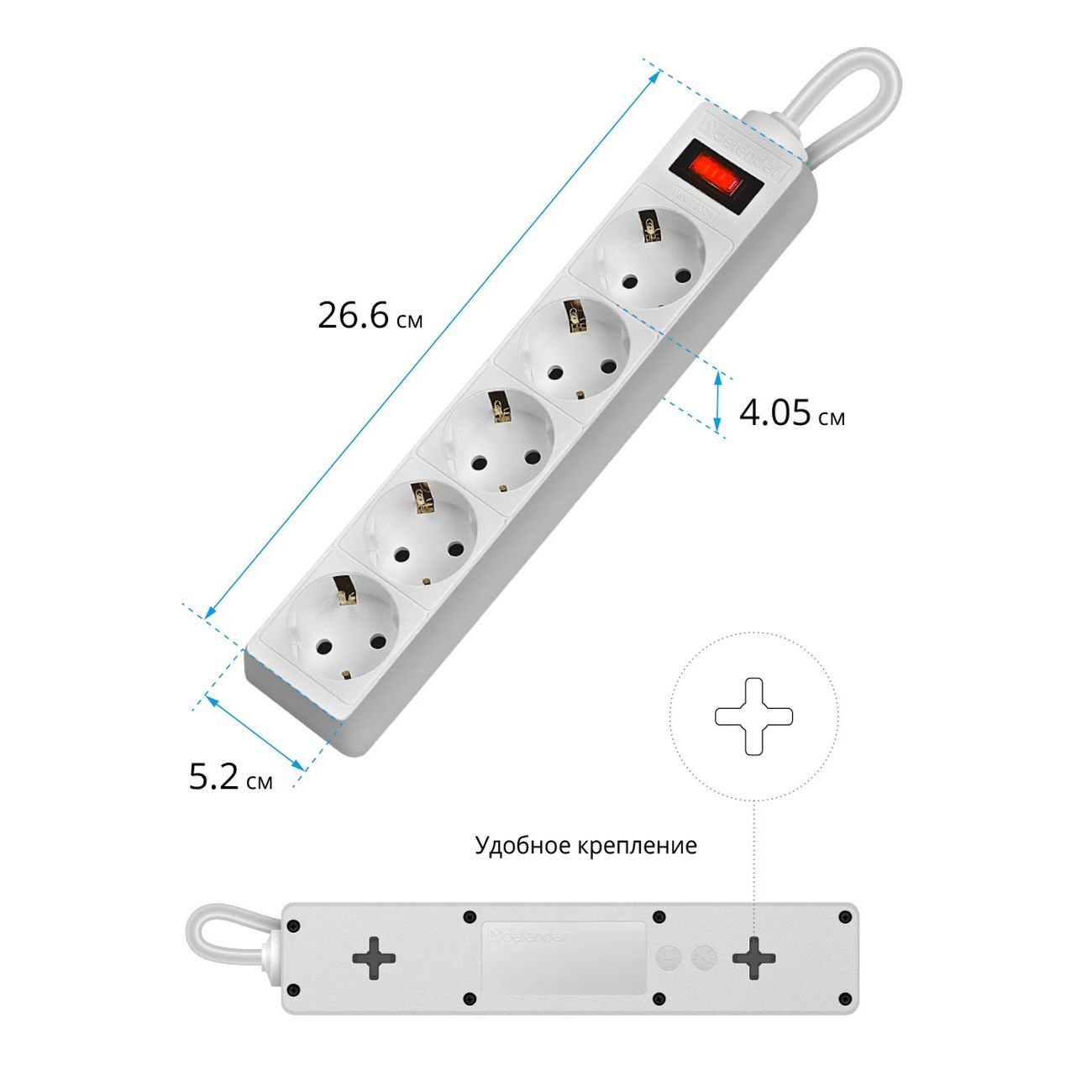 Сетевой фильтр оснащён пятью розетками типа «евростандарт». Он надёжно защищает вашу технику от короткого замыкания, перегрузок по току и возникающих импульсных помех. Корпус прибора сделан из высокопрочного негорючего пластика.
