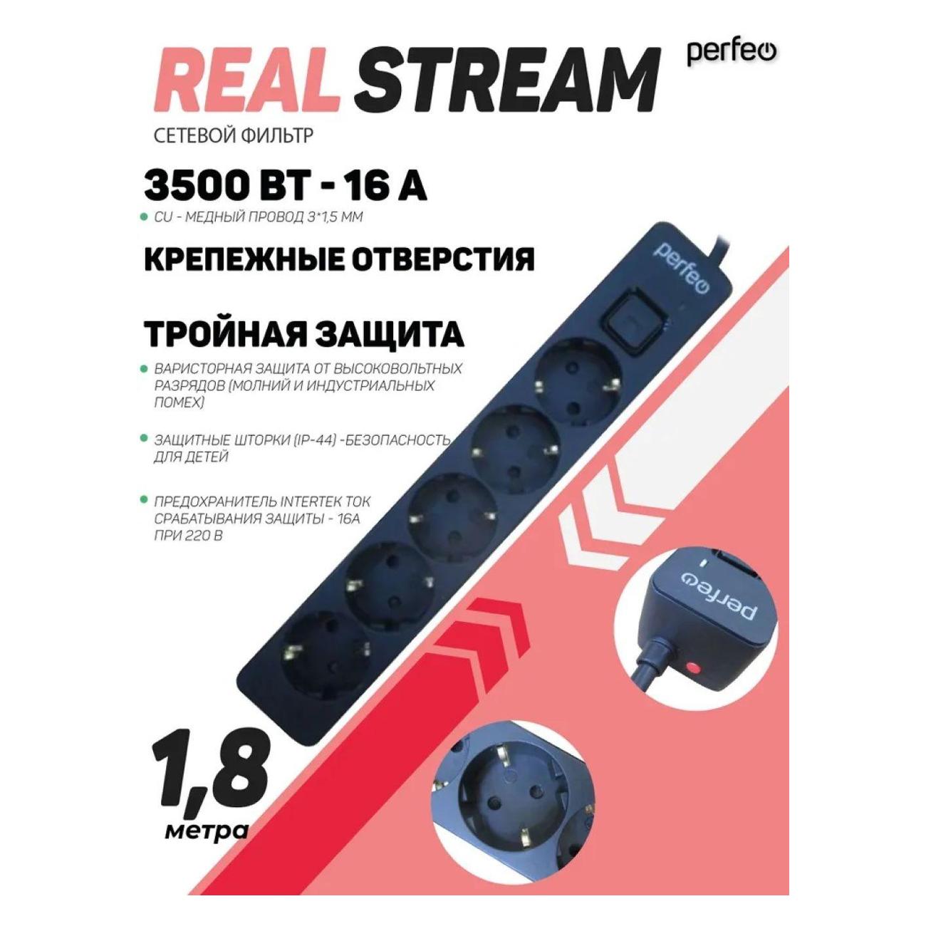 Вы можете купить Сетевой фильтр Perfeo Real Stream 1.8м черный в магазинах М.Видео по доступной цене. Сетевой фильтр Perfeo Real Stream 1.8м черный: подробное описание, фото и отзывы реальных покупателей, характеристики, возможность скачать инструкции и подобрать аксессуары.