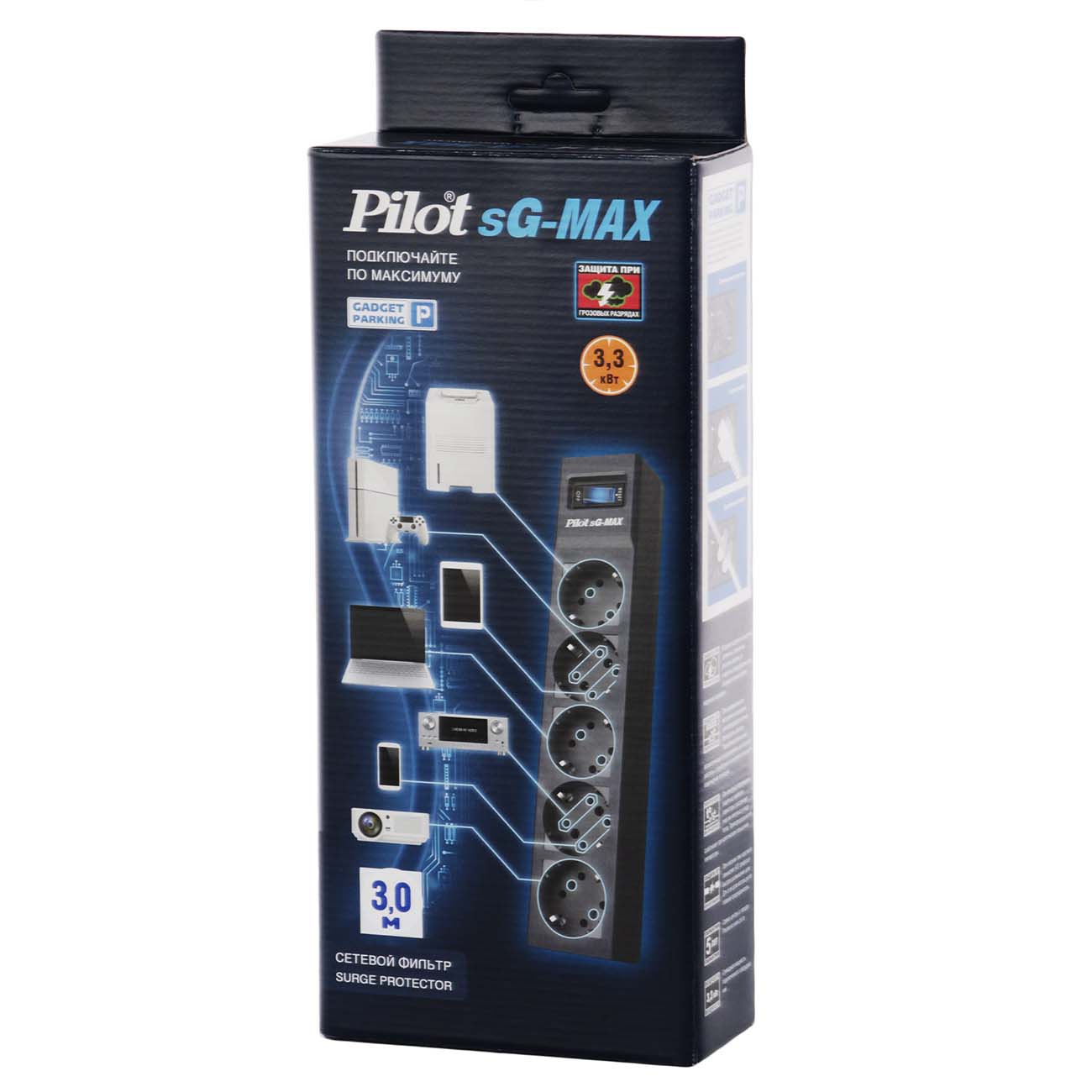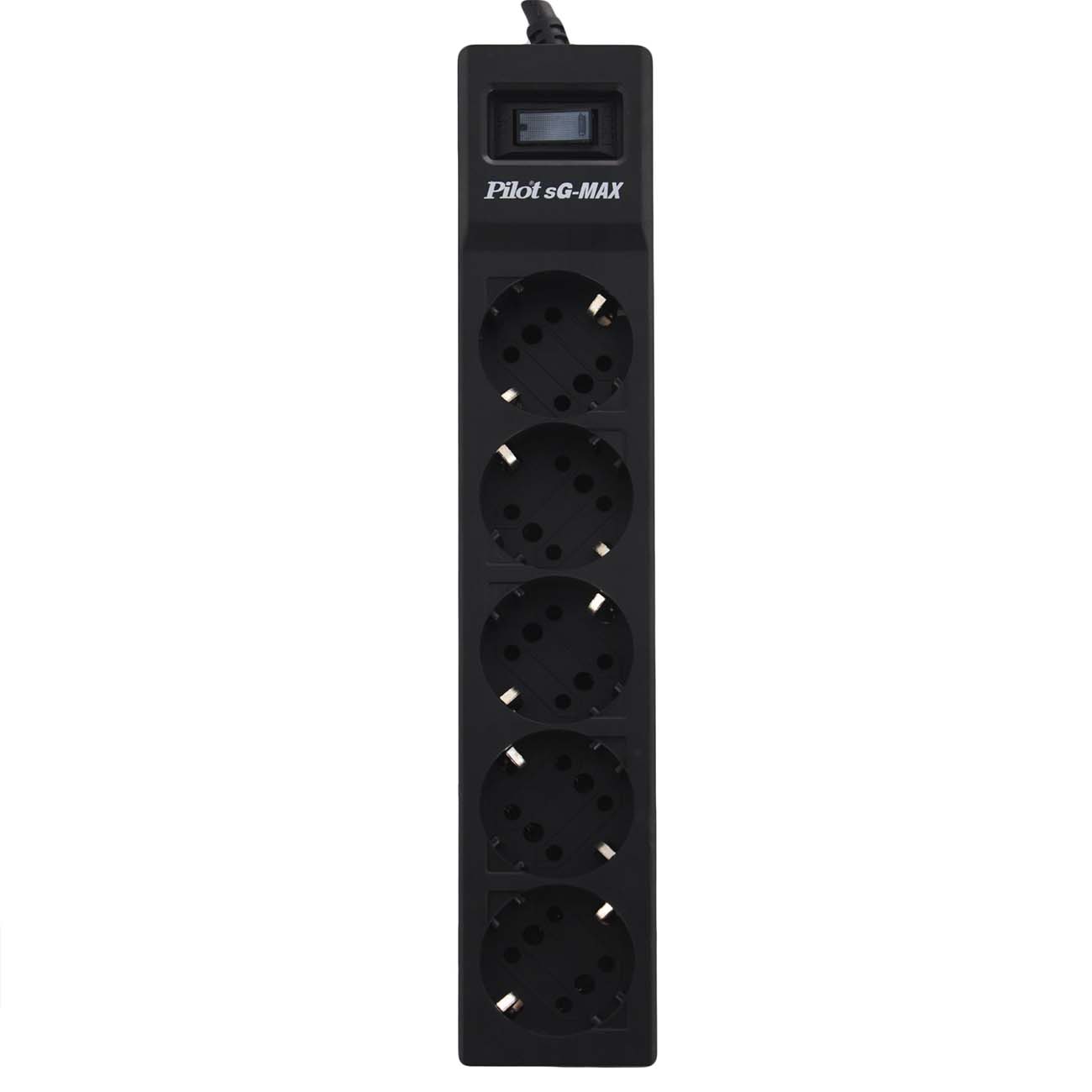 Сетевой фильтр Pilot SG Max рассчитан на подключение пяти потребителей, суммарная потребляемая мощность которых не превышает 3300 Вт. Тип розеток — евростандарт, конфигурация — утопленные. Есть защита от перегрузки и импульсных помех. На корпусе присутствует кнопочный выключатель с подсветкой.