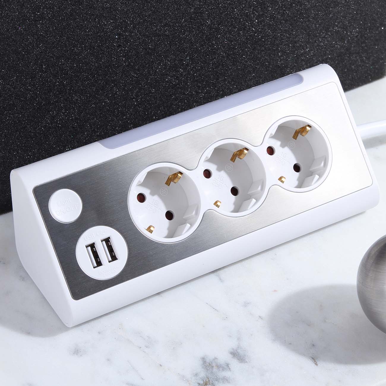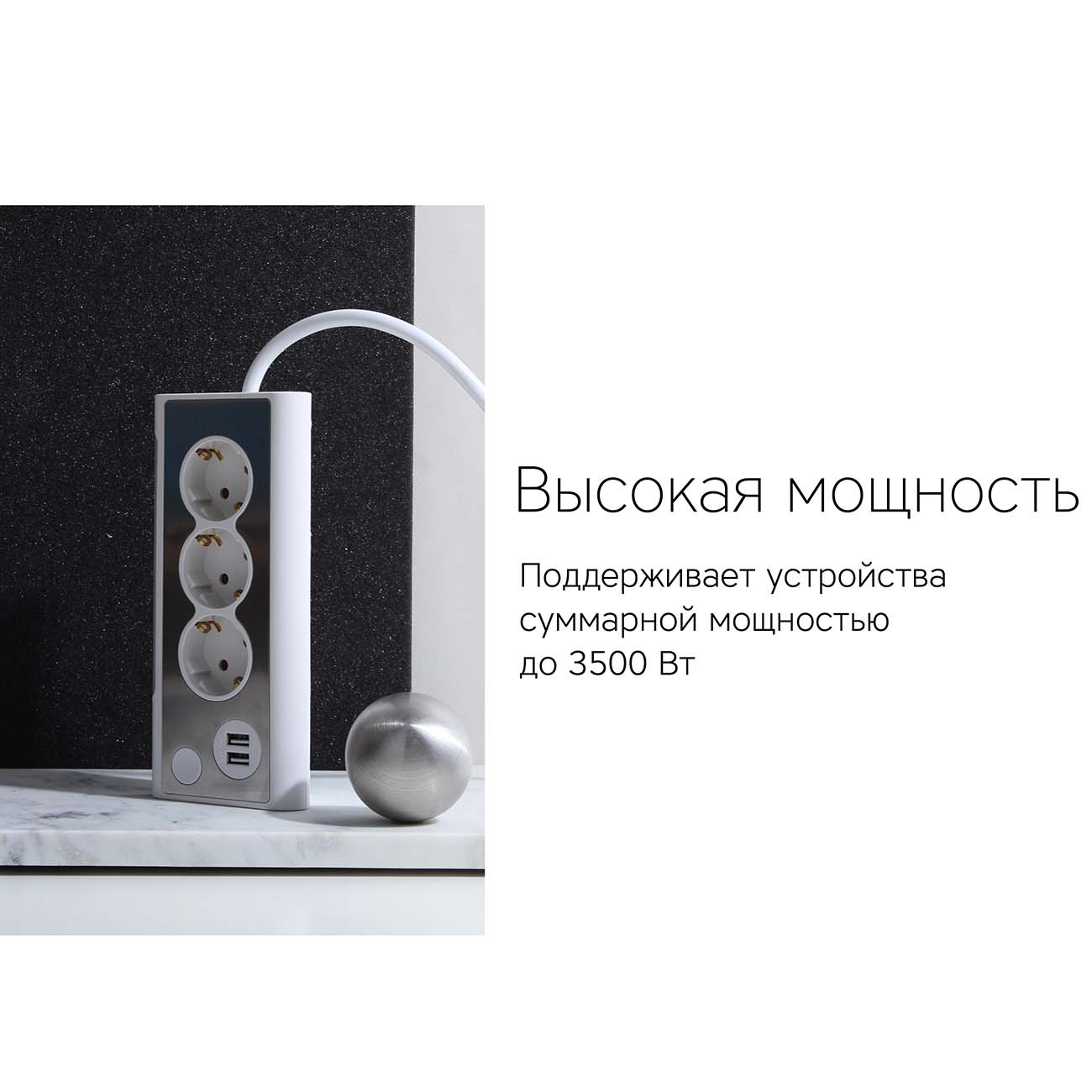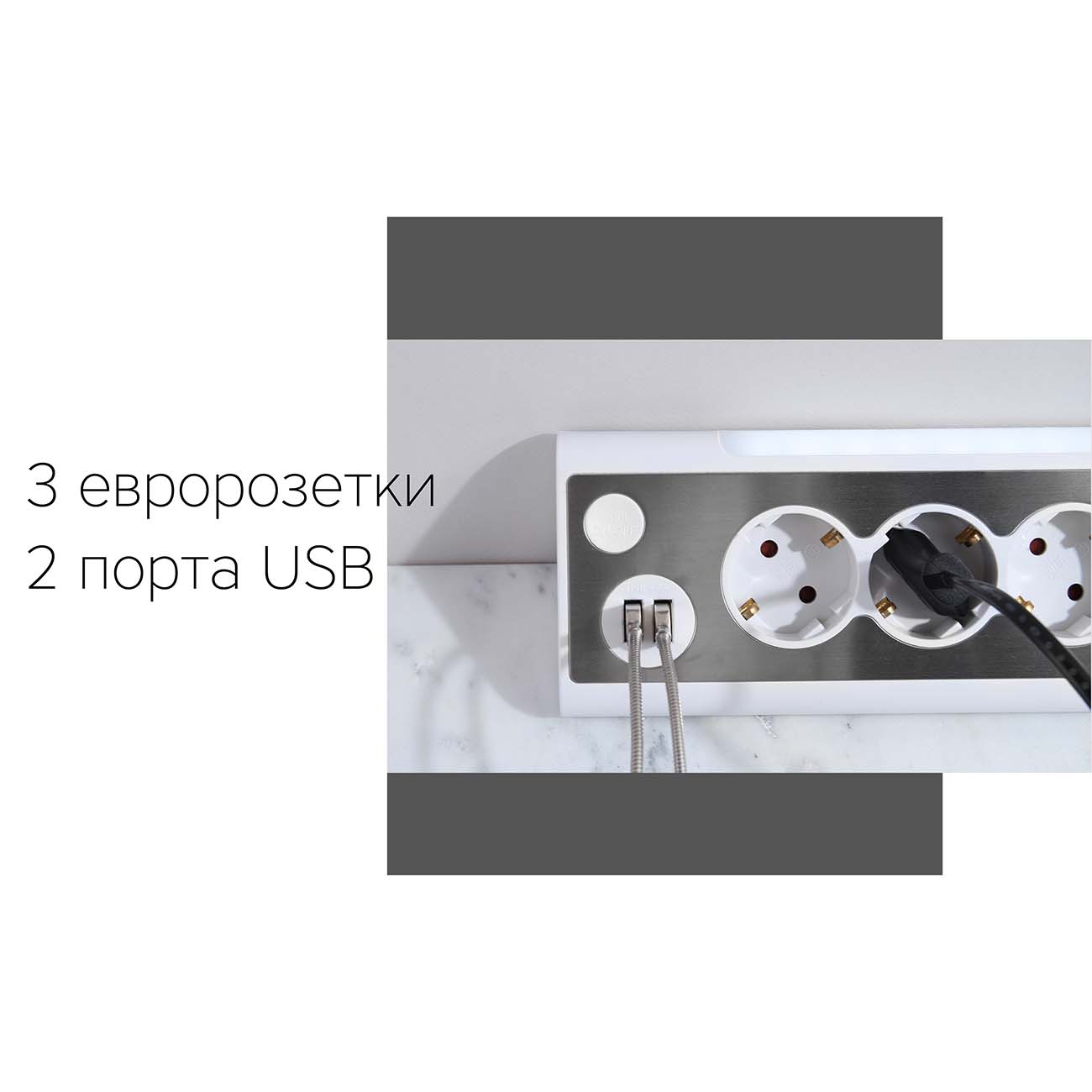 Прибор оснащён тремя утопленными розетками типа «Евростандарт» и двумя портами USB для зарядки совместимых девайсов, например, смартфонов. Безопасность использования обеспечивают корпус, который выполнен из прочного пластика, не склонного к возгоранию, и заземляющий контакт.