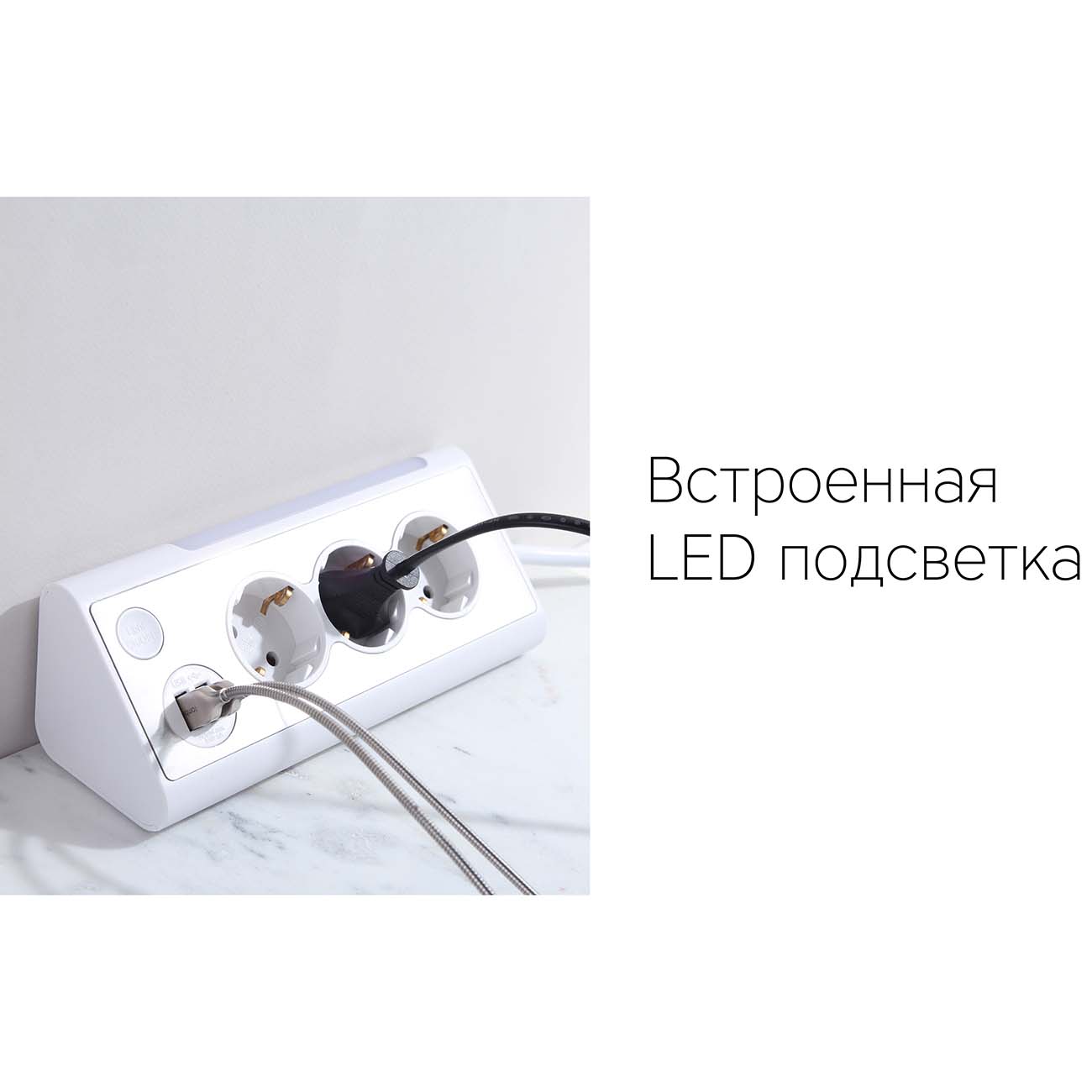 Длина сетевого шнура составляет 1,5 м. Сетевой фильтр можно поставить на пол или закрепить на стене. Подсветка позволит с удобством использовать устройство даже в темноте – вам не придётся искать розетку. При желании её легко отключить, для чего есть специальная кнопка.