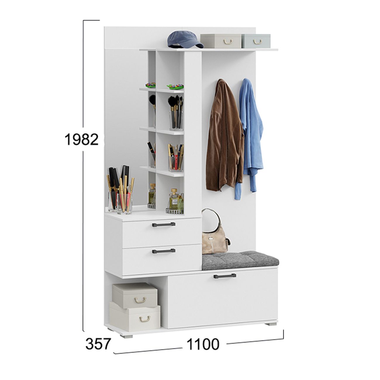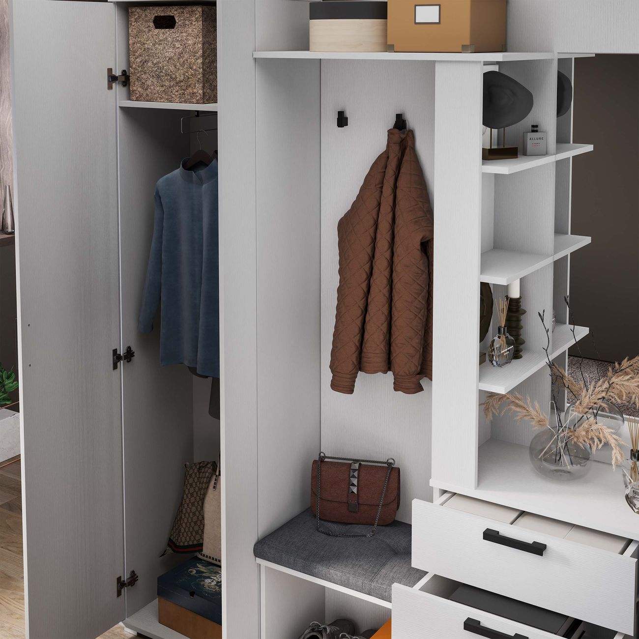 Благодаря компактности и продуманной конструкции, модули не займут много места в комнате, обеспечив при этом максимальный комфорт.  «Эрика» станет отличным выбором для тех, кто хочет сэкономить пространство, имея при этом все необходимые для входной зоны элементы. Благодаря разнообразию цветовой палитры прихожая «Эрика» идеально подойдет как для светлого помещения, так и для интерьеров в темных тонах, сделав комнату предметом особого внимания и притяжения. Прихожая оснащена комбинированной вешалкой, которая включает в себя крючки для одежды в цвет лицевой фурнитуры, мягким сидением, небольшим зеркалом, закрытыми и открытыми отсеками для хранения разных предметов. На верхней полке можно расположить головные уборы, а на нижней другие необходимые аксессуары или обувь. Наличие шкафа позволит решить проблему с размещением сезонной одежды.