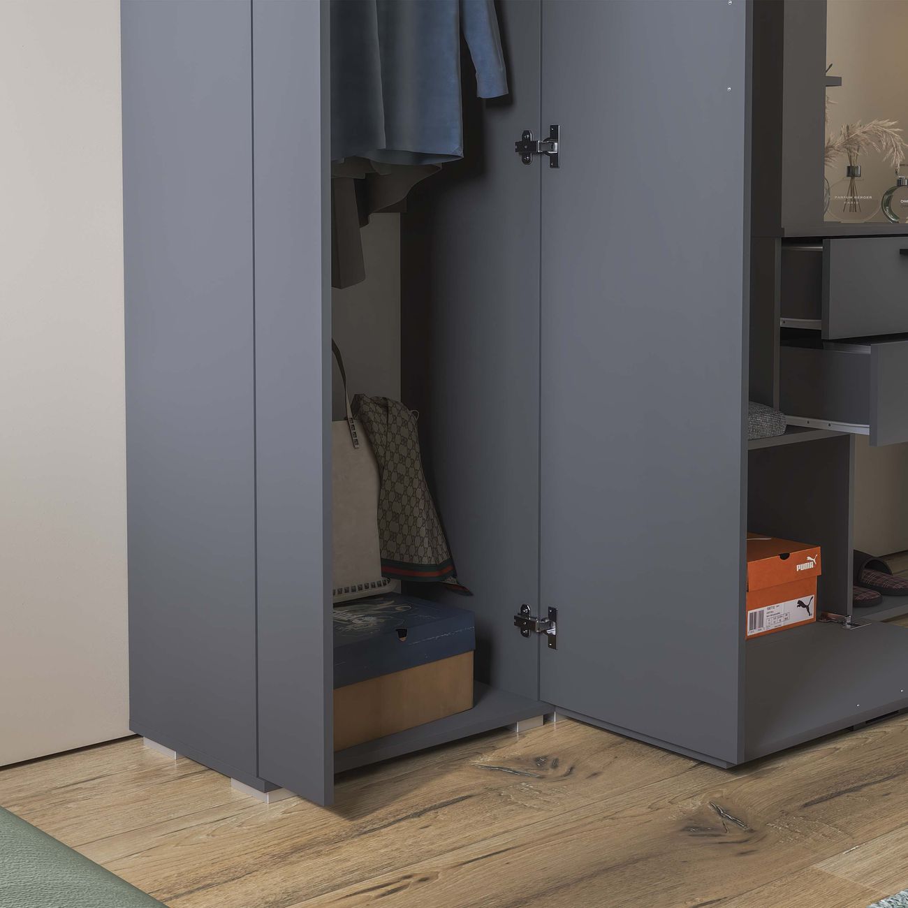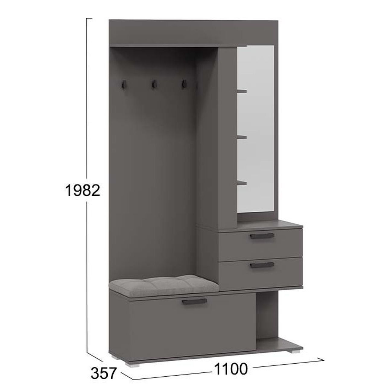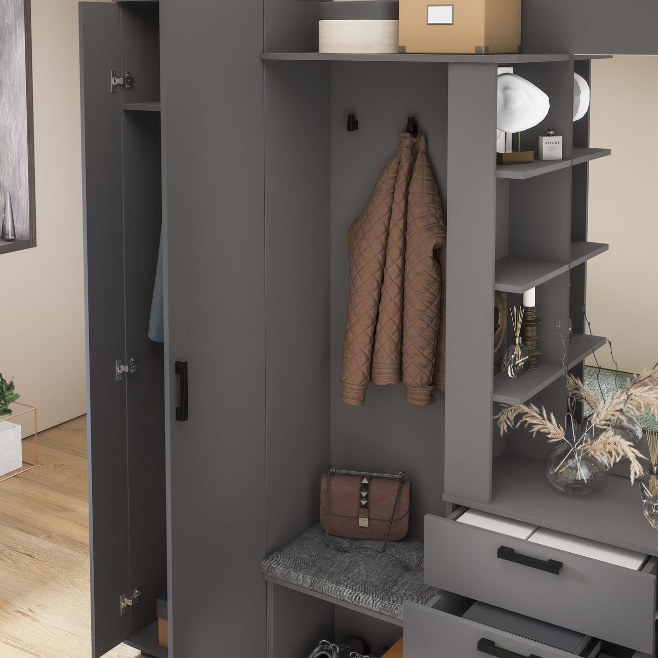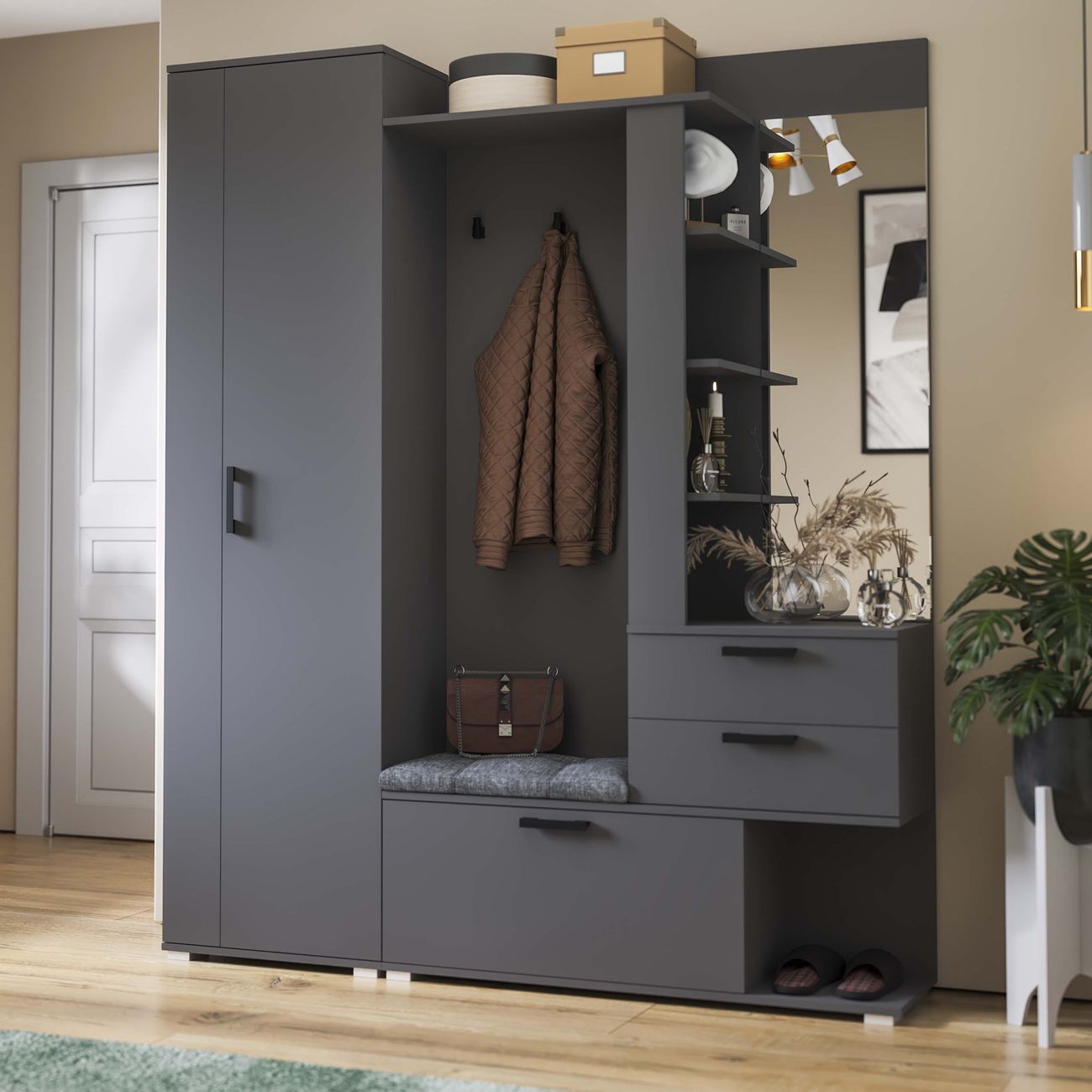 Благодаря компактности и продуманной конструкции, модули не займут много места в комнате, обеспечив при этом максимальный комфорт. «Эрика» станет отличным выбором для тех, кто хочет сэкономить пространство, имея при этом все необходимые для входной зоны элементы. Благодаря разнообразию цветовой палитры прихожая «Эрика» идеально подойдет как для светлого помещения, так и для интерьеров в темных тонах, сделав комнату предметом особого внимания и притяжения. Прихожая оснащена комбинированной вешалкой, которая включает в себя крючки для одежды в цвет лицевой фурнитуры, мягким сидением, небольшим зеркалом, закрытыми и открытыми отсеками для хранения разных предметов. На верхней полке можно расположить головные уборы, а на нижней другие необходимые аксессуары или обувь. Наличие шкафа позволит решить проблему с размещением сезонной одежды.