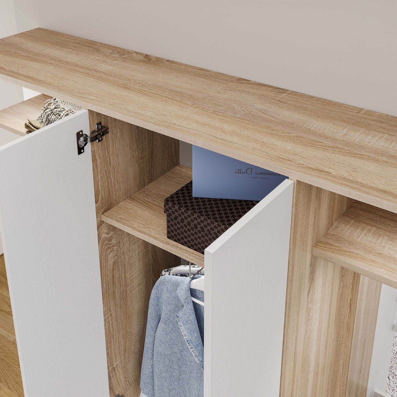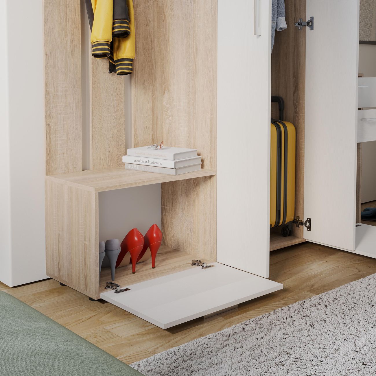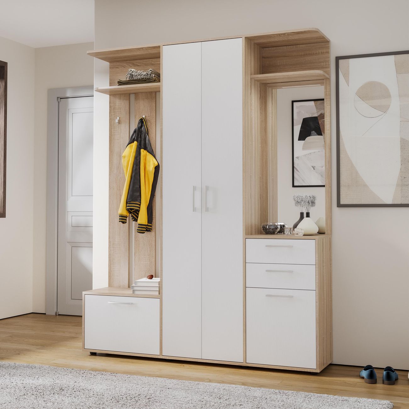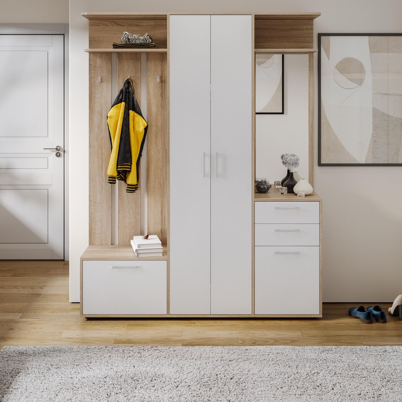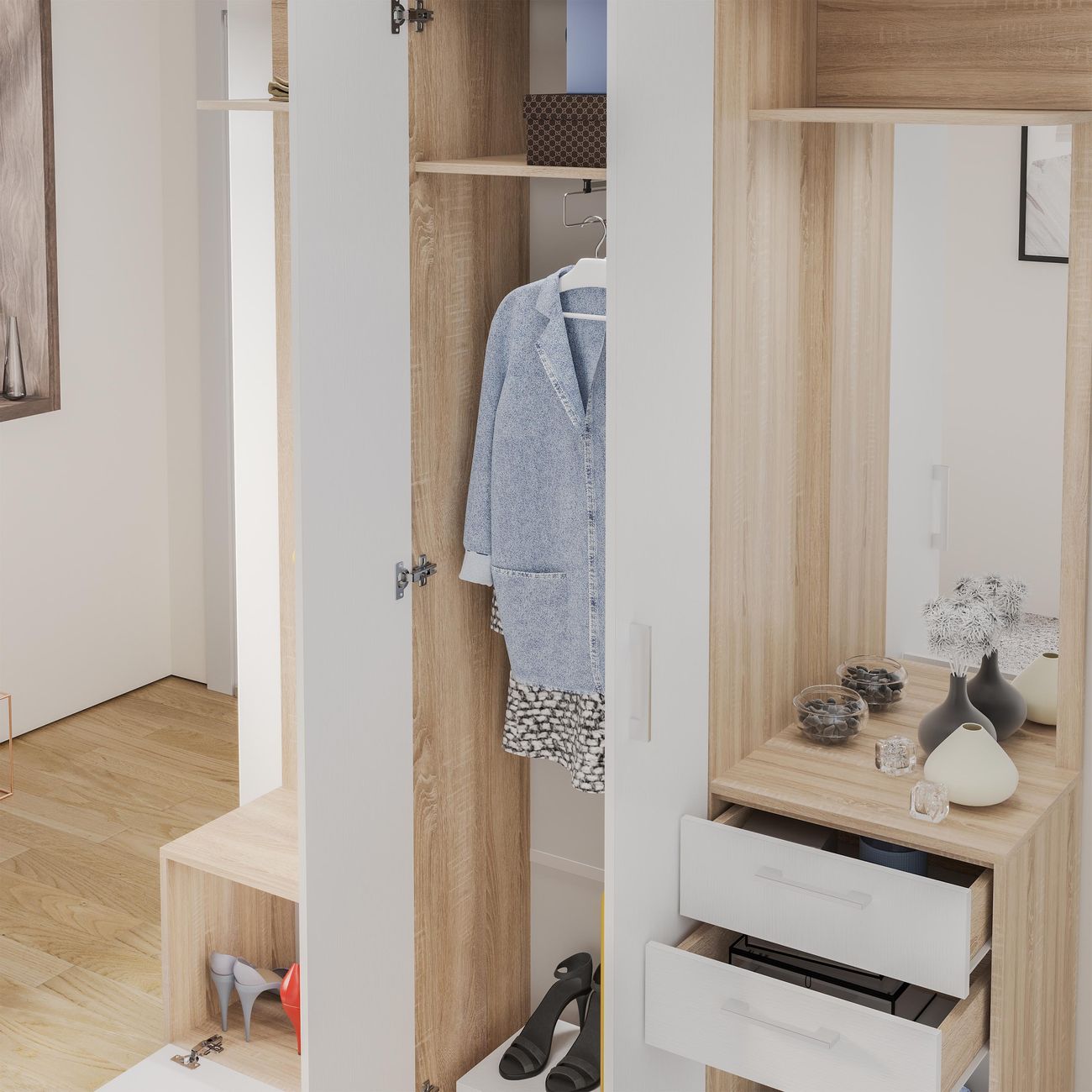 Набор мебели для прихожей Витра является идеальным вариантом для хранения вещей в доме. Стенка для прихожей включает в себя секцию с сидением(мягкий элемент в комплект не входит) и ящиком, шкаф и тумбу с зеркалом. Прихожая является вместительной и удобной, Вы легко и быстро можете собраться при выходе из дома. Стенка в прихожей имеет сбалансированную конструкцию, доступную цену и разнообразие расцветок набора, что позволит Вам приобрести подходящую модель для помещения, оформленного в любом стиле. Идеальный вариант для тех, кто ищет долговечное и стильное решение для хранения своей одежды, аксессуаров и обуви в прихожей. Материалы Мебель выполнена из экологически чистых материалов высокого качества, что гарантирует надежную сохранность вещей в первозданном виде. Модель оборудована выдвижной мебельной штангой, тумбами, ящиками и зеркалом для удобства примерки одежды и оценки внешнего вида. Ящики можно использовать как обувницы. Качественные материалы делают набор мебели для гостиной износостойким, способным прослужить многие годы - используется высококачественный безопасный ЛДСП - 16 мм. Благодаря данной мебели ежедневные сборы станут быстрее и проще. Дополнительная информация Поставляется в разобранном виде. Все технические отверстия сделаны на производстве, фурнитура для сборки и инструкция идет в комплекте, также инструкцию Вы можете найти в карточке товара. Прежде чем приступить к сборке, необходимо убедиться в качестве, количестве и соответствии всех деталей. Если таковые выявлены, незамедлительно свяжитесь с площадкой и продавцом, для разрешения вопроса, не приступая к сбору изделия.