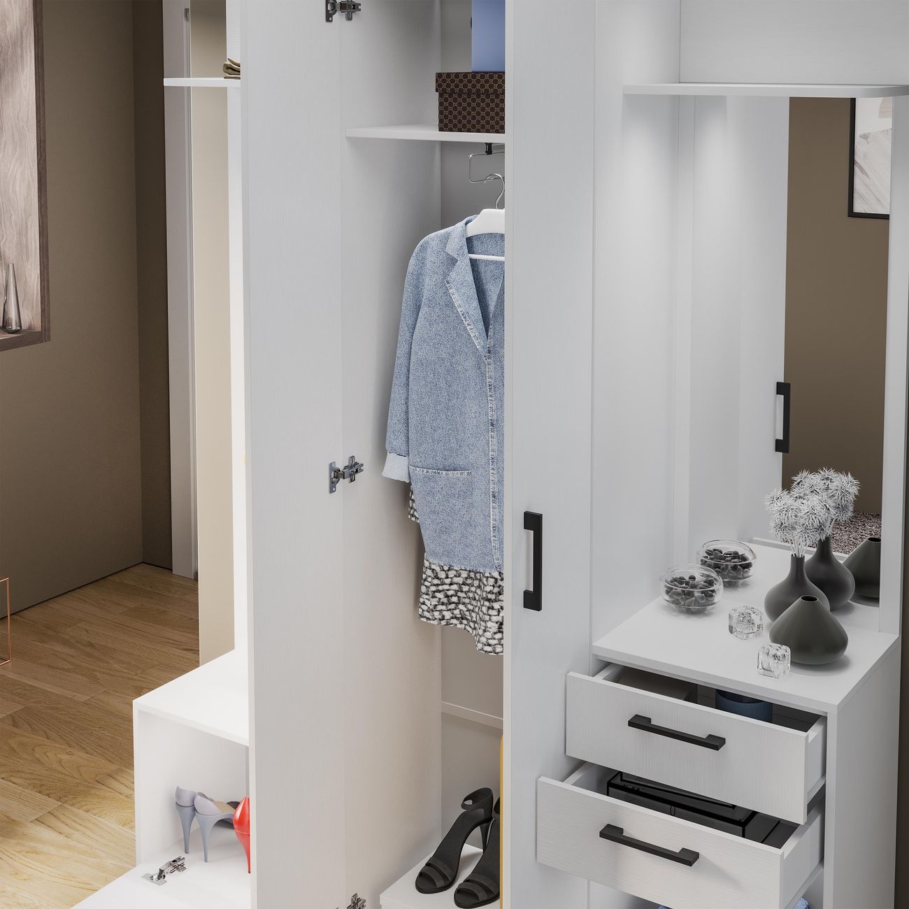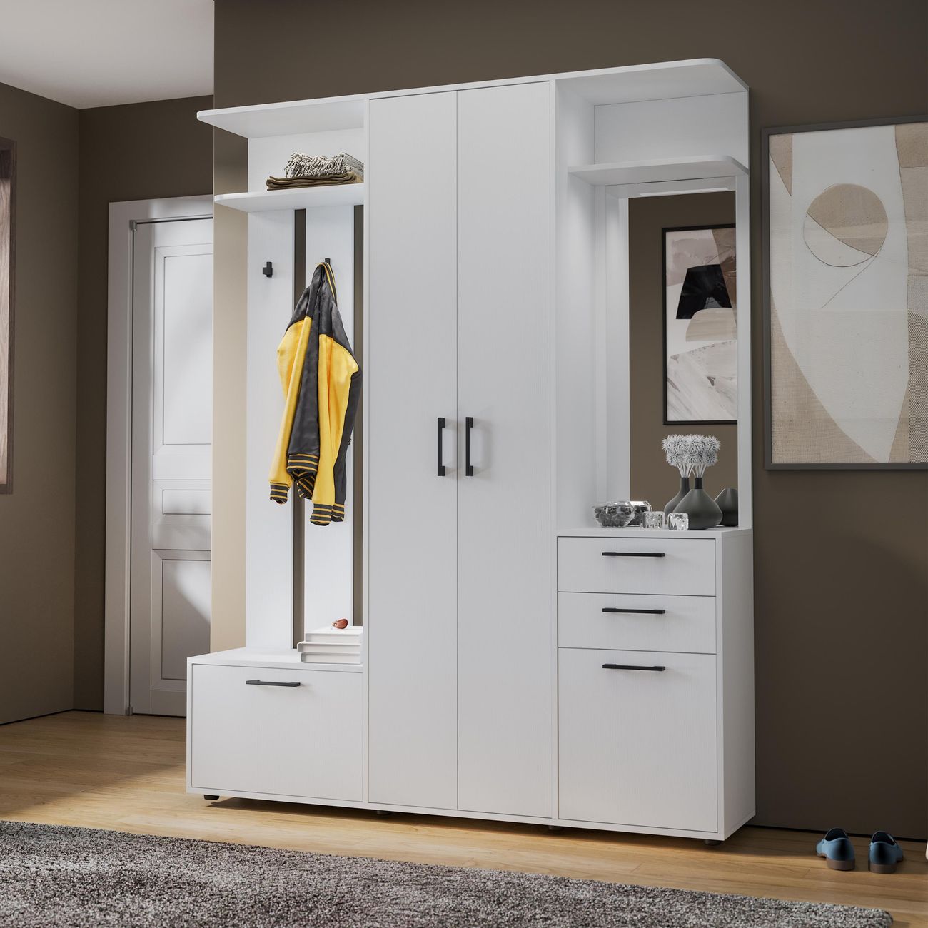 Набор мебели для прихожей «Витра» тип 2 – это идеальный вариант обустройства небольшой прихожей для тех, кто предпочитает максимальную функциональность и эстетичность мебели. Благодаря компактности и продуманной конструкции, наша новинка займет минимальное пространство в комнате, обеспечив при этом удобство и комфорт.Набор мебели для прихожей Витра является идеальным вариантом для хранения вещей в доме. Стенка для прихожей включает в себя секцию с сидением(мягкий элемент в комплект не входит) и ящиком, шкаф и тумбу с зеркалом. Прихожая является вместительной и удобной, Вы легко и быстро можете собраться при выходе из дома. Стенка в прихожей имеет сбалансированную конструкцию, доступную цену и разнообразие расцветок набора, что позволит Вам приобрести подходящую модель для помещения, оформленного в любом стиле. Идеальный вариант для тех, кто ищет долговечное и стильное решение для хранения своей одежды, аксессуаров и обуви в прихожей. Материалы Мебель выполнена из экологически чистых материалов высокого качества, что гарантирует надежную сохранность вещей в первозданном виде. Модель оборудована выдвижной мебельной штангой, тумбами, ящиками и зеркалом для удобства примерки одежды и оценки внешнего вида. Ящики можно использовать как обувницы. Качественные материалы делают набор мебели для гостиной износостойким, способным прослужить многие годы - используется высококачественный безопасный ЛДСП - 16 мм. Благодаря данной мебели ежедневные сборы станут быстрее и проще. Дополнительная информация Поставляется в разобранном виде. Все технические отверстия сделаны на производстве, фурнитура для сборки и инструкция идет в комплекте, также инструкцию Вы можете найти в карточке товара. Прежде чем приступить к сборке, необходимо убедиться в качестве, количестве и соответствии всех деталей. Если таковые выявлены, незамедлительно свяжитесь с площадкой и продавцом, для разрешения вопроса, не приступая к сбору изделия.