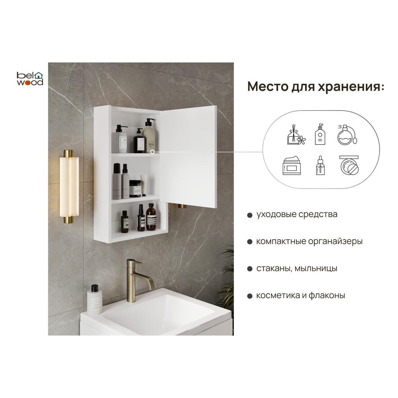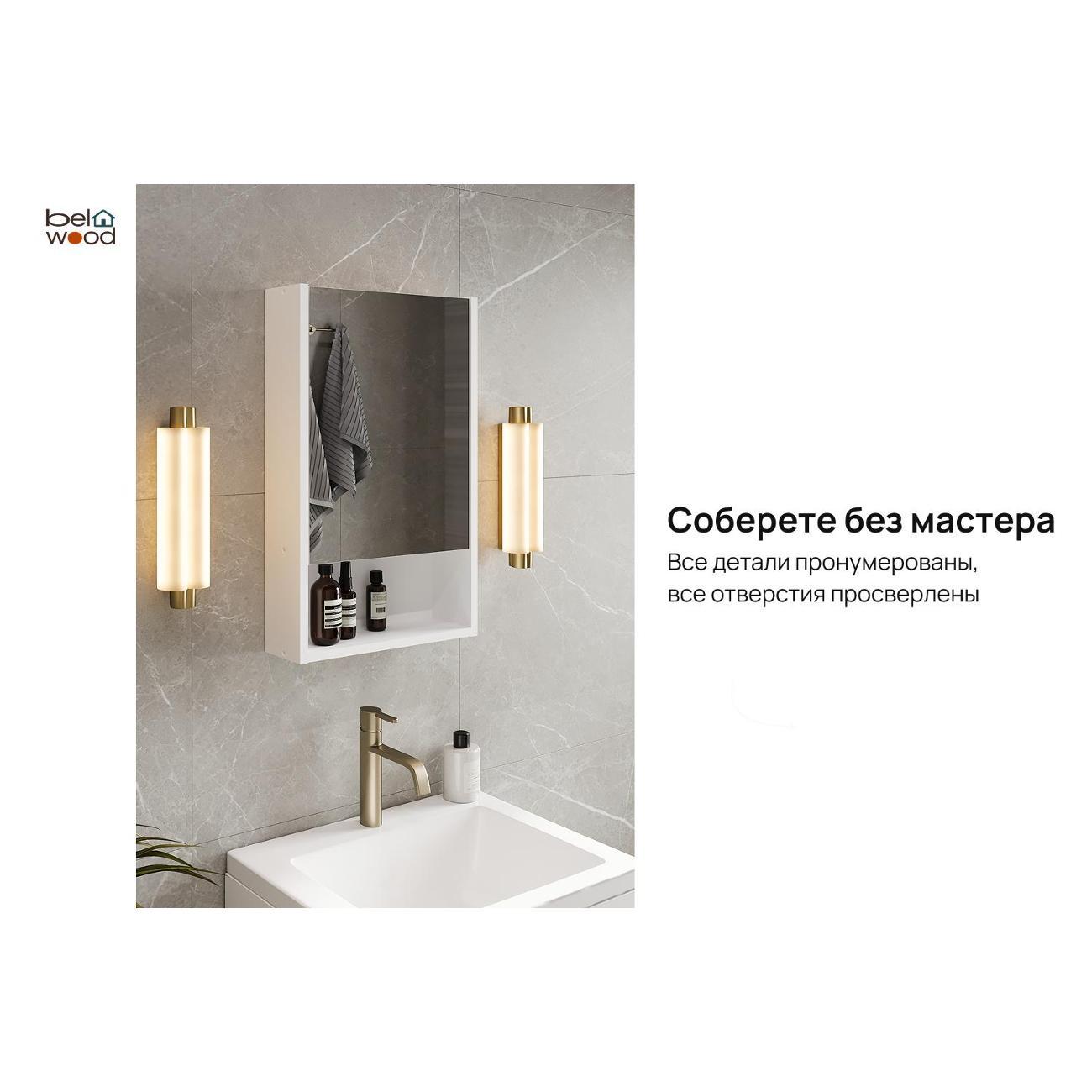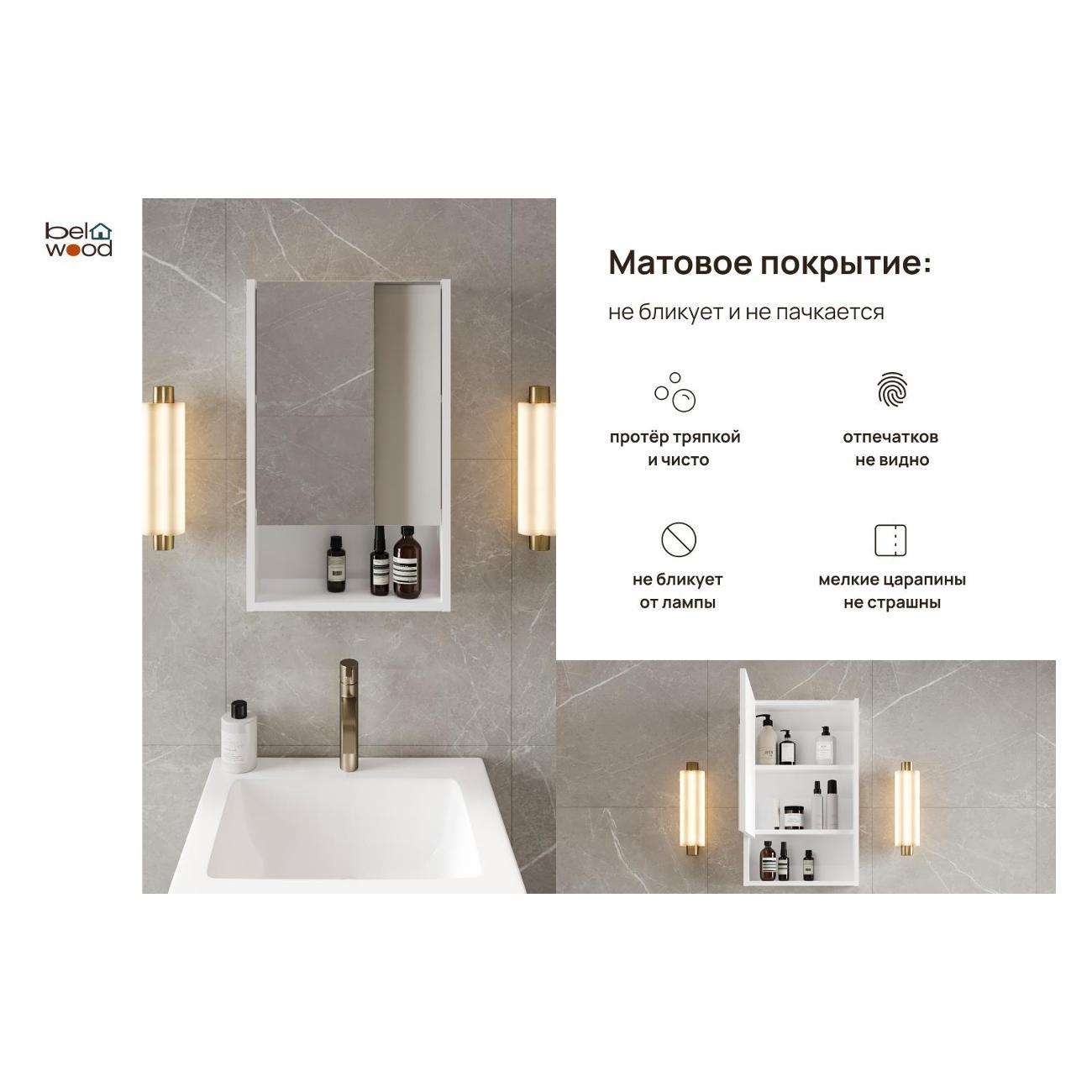 Фасад и корпус изготовлены из белого матового ЛДСП с прочной ПВХ-кромкой, что обеспечивает устойчивость к влаге, воздействию бытовой химии и защищает изделие от механических повреждений. Навесной шкаф с зеркалом оснащён тремя открытыми полками для повседневных мелочей и тремя закрытыми полками, скрытыми за распашными дверцами, что помогает поддерживать порядок и аккуратный внешний вид.