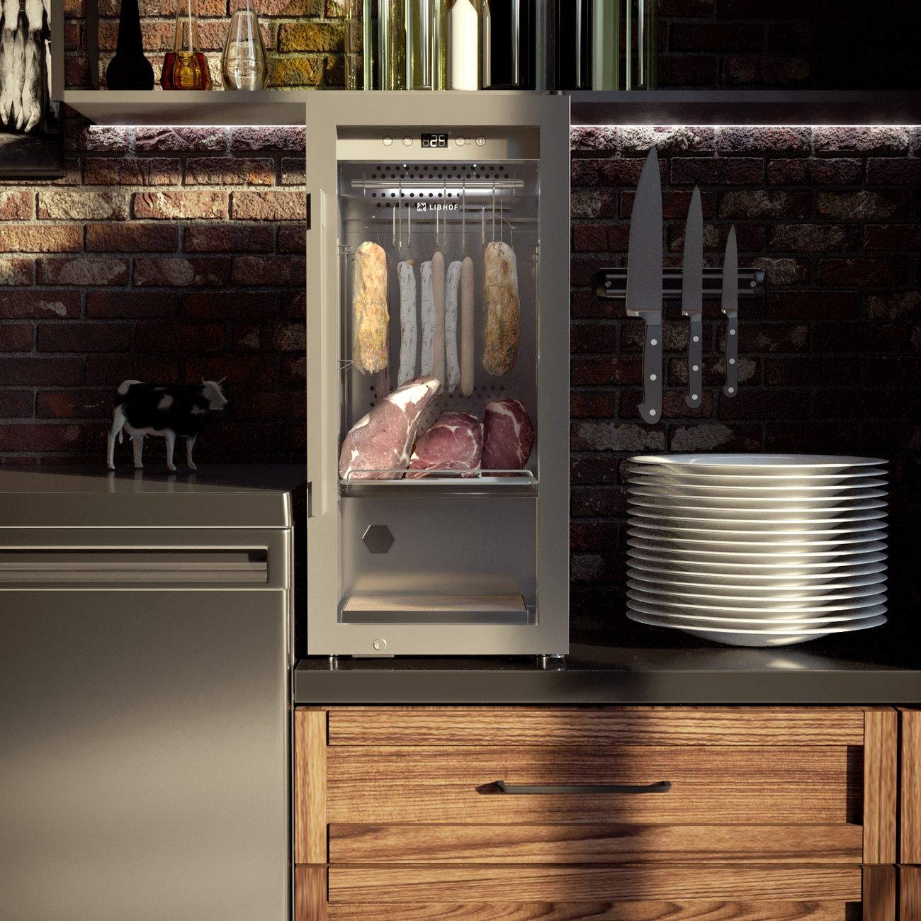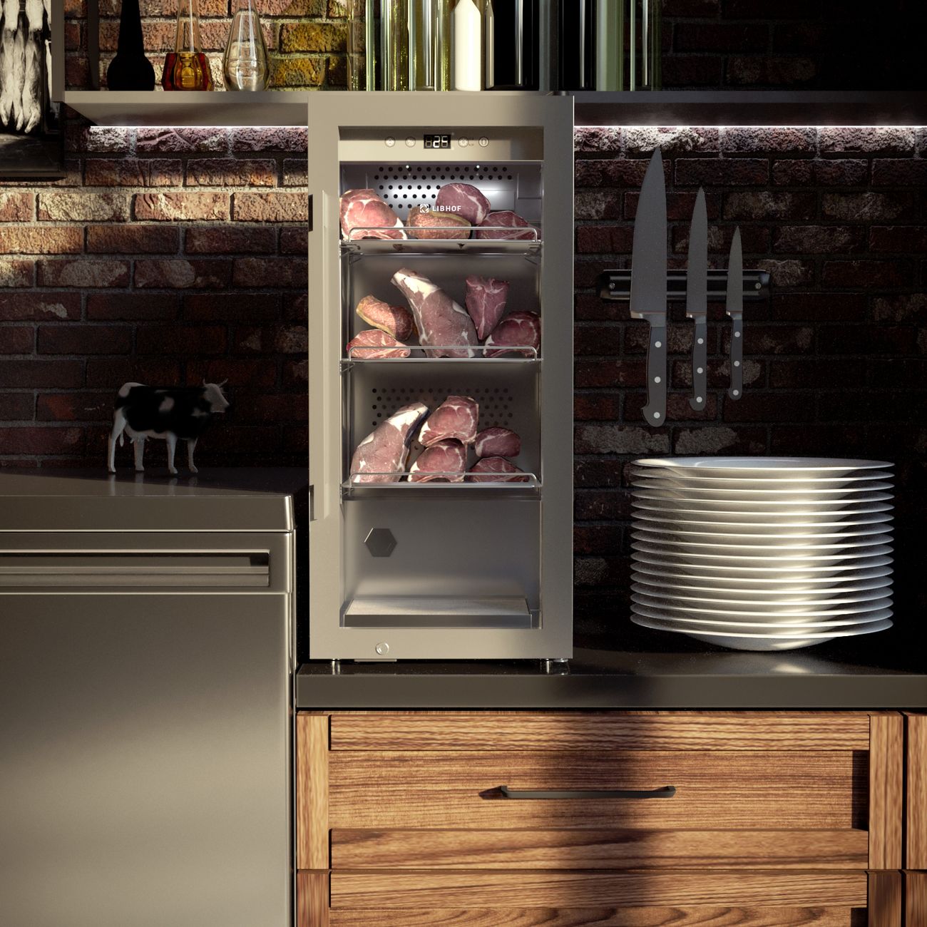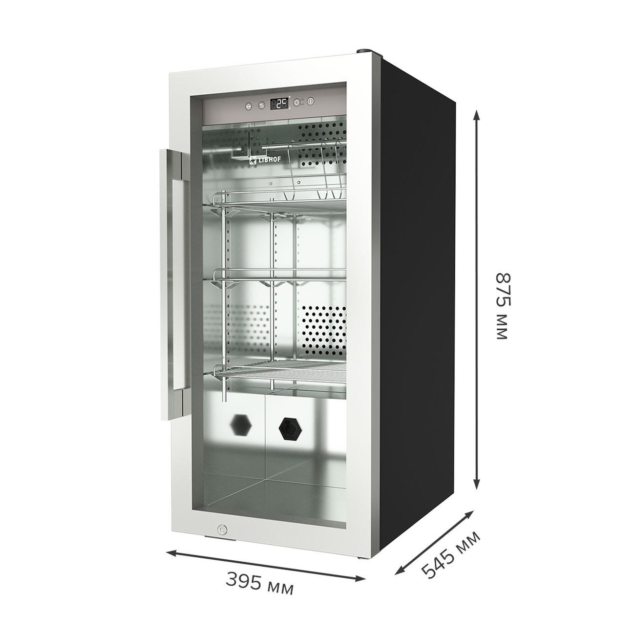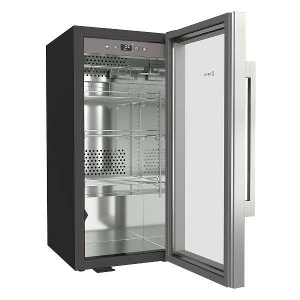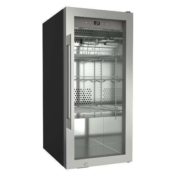 Серебристый шкаф для вызревания мяса Libhof DA-75 цвета «серебристый металлик» с четырьмя полками оснащен системой фильтрации, защищающей от появления неприятного запаха. Присутствует встроенная ультрафиолетовая лампа, предотвращающая размножение бактерий. Внутри шкафа поддерживается температура в диапазоне от +2°C до +14°C, уровень влажности — от 50% до 85%.