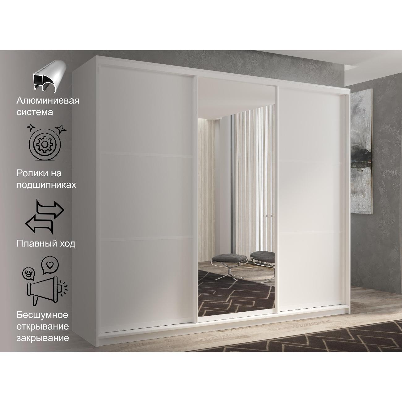 Шкаф-купе выполнен в современном стиле и представлен в белом цвете с зеркалами и тремя цветовыми решениями профиля ЗОЛОТОЙ, ЧЕРНЫЙ и БЕЛЫЙ. Это отличное решение для современной спальни, прихожей, детской которое поможет организовать хранение вещей и сделает интерьер более стильным и светлым. Особенностью шкафа является наличие раздвижных дверей, которые экономят пространство и обеспечивают удобный доступ к содержимому. Внутри шкафа расположены 8 полок, 2 штанги для вешалок, располагать полки и штанги внутри шкафа можно на любой высоте и в любом отсеке, что позволяет максимально эффективно использовать пространство, опционально можно установить блок ящиков. Зеркала на дверцах шкафа увеличивают пространство и делают его более светлым. Шкаф-купе оснащен стопорами колес, что позволяет предотвращает самопроизвольное открывание дверей. Съемные полки позволяют легко менять их расположение в зависимости от потребностей. Шкаф-купе имеет три двери и три равных по ширине отсека. Материал корпуса и фасада – ЛДСП, все зеркала и стекла оснащены противоосколочной пленкой.