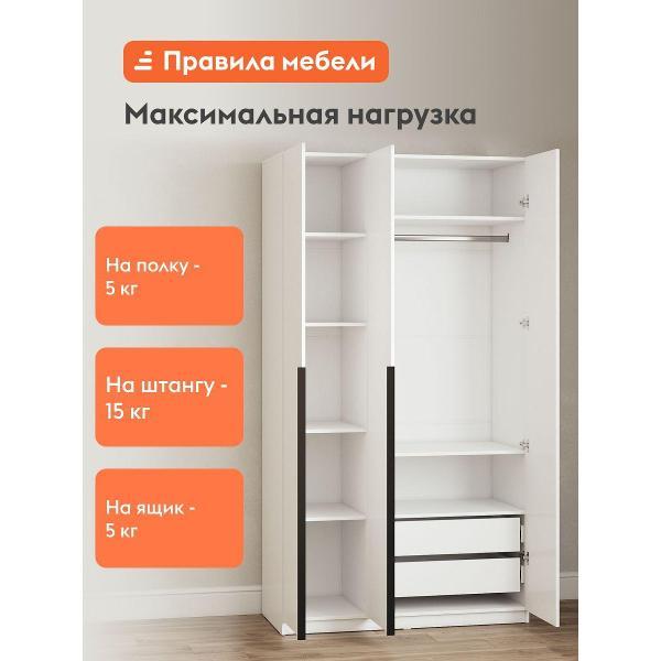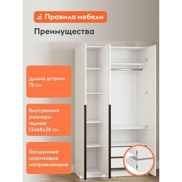 Распашной шкаф Сеул 3 двери организует удобное хранение всего необходимого. Узкие вытянутые ручки выполняют как основную, так и декоративную функцию. В комплектации с ящиками модель подходит для любых предметов гардероба: от верхней одежды до белья и аксессуаров. Стандартное наполнение оставляет больше места для габаритных вещей.