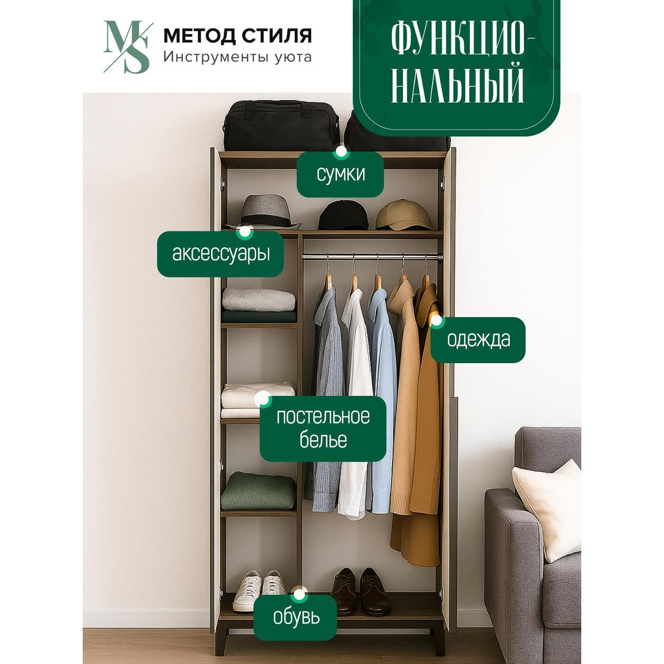 Внутреннее пространство шкафа организовано с полками, штангой для вешалок, которые позволяют рационально разместить вещи и сохранить порядок. Ножки изделия обеспечивают устойчивость и защиту от влаги на полу. Модульный дизайн делает этот шкаф универсальным для использования в прихожей, гардеробной или даже на балконе. Благодаря своей эргономике он отлично впишется в кухню или комнату отдыха.