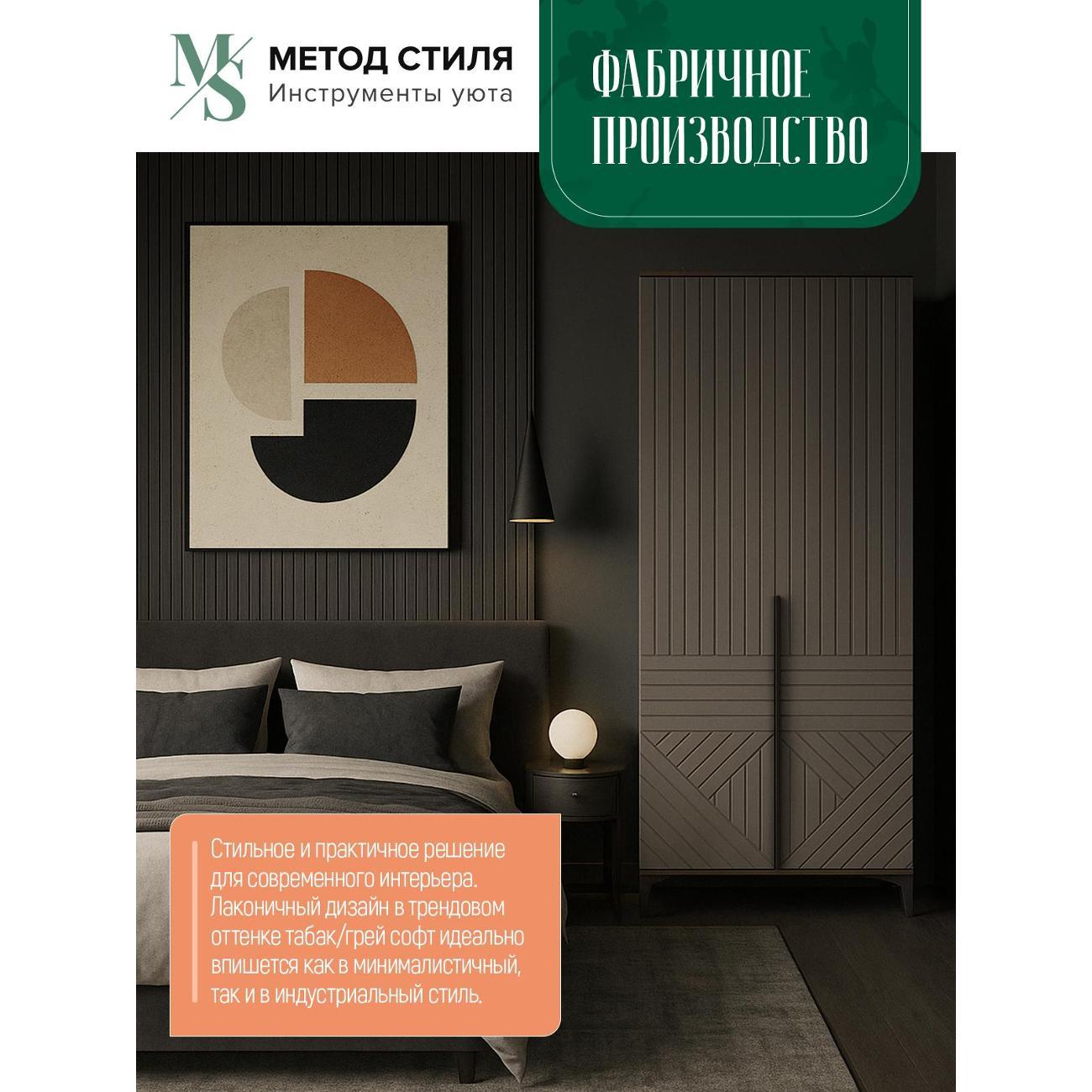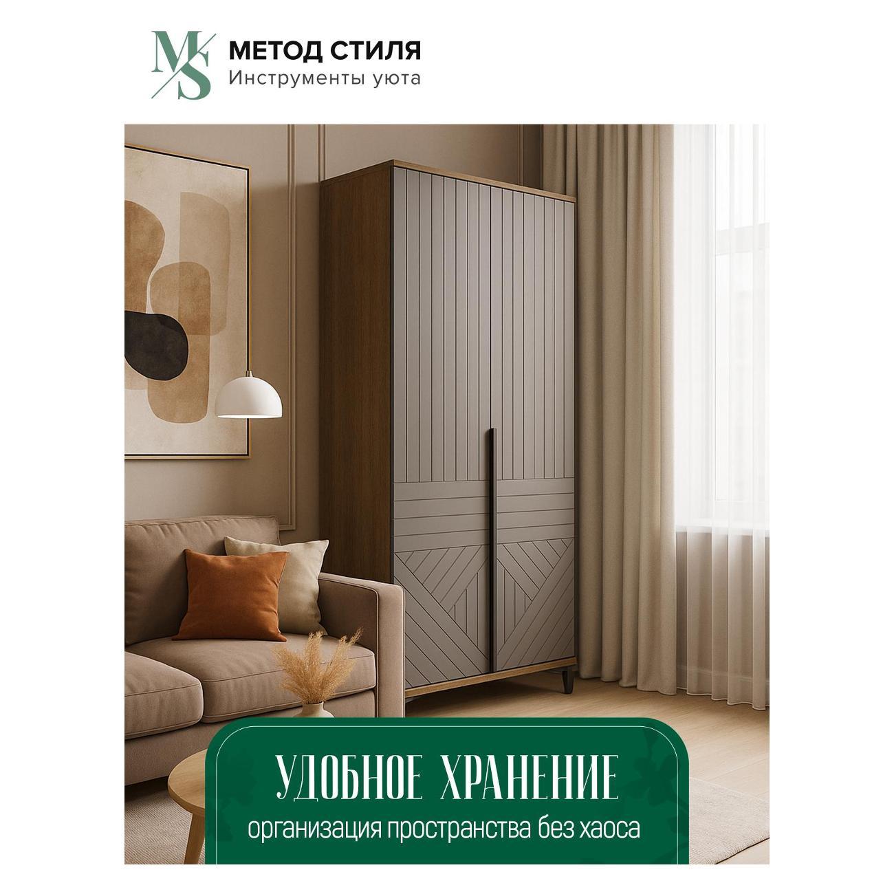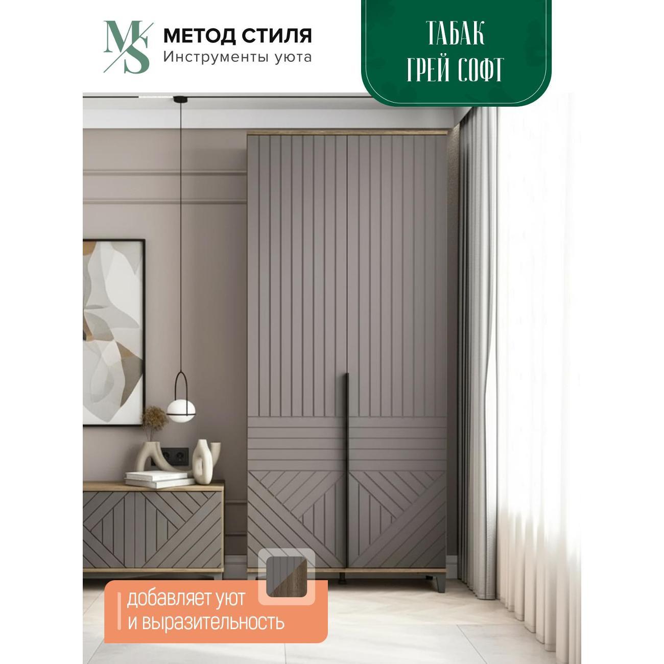 Распашной шкаф с двумя створками из ЛДСП и МДФ станет функциональным элементом мебели для любой комнаты квартиры-студии, гостиной, спальни или детской. Фасад МДФ выполнен в сером оттенке грей софт с коричневыми акцентами корпуса ЛДСП, что придает изделию современный и уютный вид. Конструкция оснащена прочными петлями и удобными ручками, обеспечивающими легкое открытие створок.