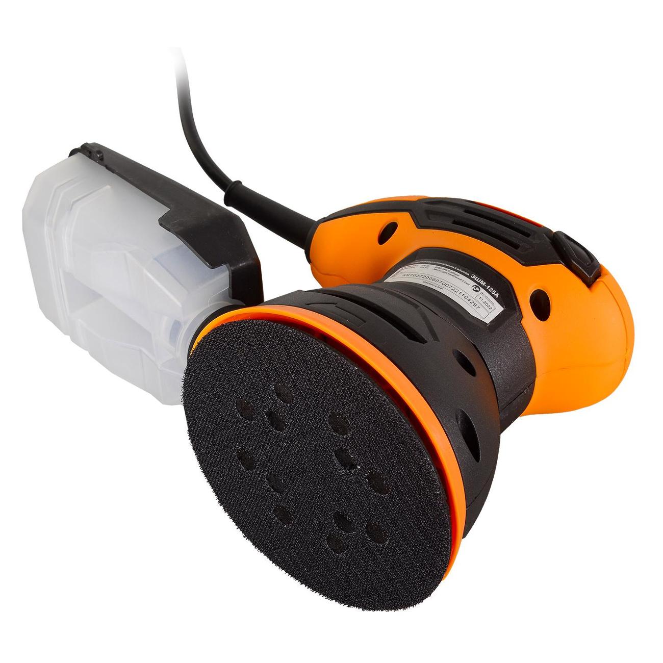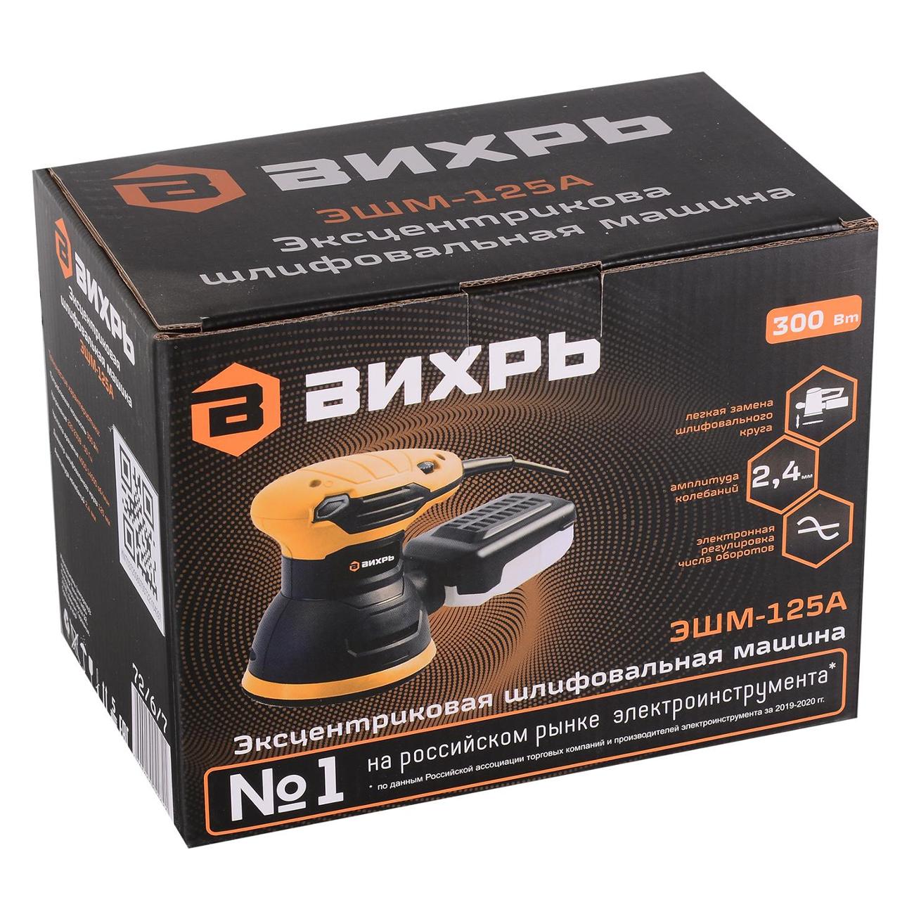 Шлифмашинка эксцентриковая «Вихрь» ЭШМ-125А с шириной круга 125 мм обладает рабочей поверхностью в виде шлифовальной ленты. Корпус изготовлен из оранжевого пластика, размещает патрубок для подключения пылесоса. В наборе со строительным инструментом идут шлифовальный круг и пылесборник. Двигатель оснащен системой стабилизации оборотов, величина колебаний — 2,4 мм. Количество вращательных движений варьируется от 4000 до 14000 об/мин. Кнопка включения блокируется. Электропитание происходит от сети, потребляемая мощность — 300 Вт. Общая масса составляет 1,5 кг.