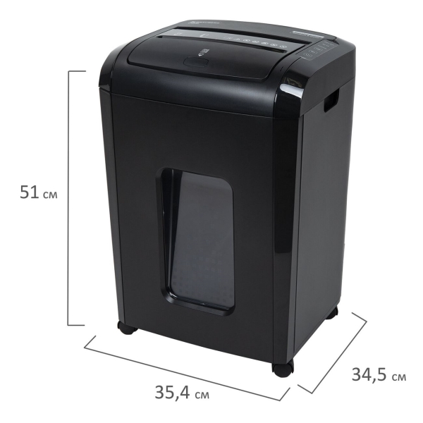 Шредер Brauberg 150M рассчитан на 150 листов формата А4 плотностью 80 г/кв. м, также может перерабатывать пластиковые карты, скрепки, скобы. Устройство обеспечивает уровень секретности P-5. Резка производится на фрагменты размером 3 х 10 мм со скоростью 2 м/мин. Время непрерывной работы не должно превышать 30 минут, после чего следует сделать такой же перерыв. Ширина входного отверстия — 220 мм, объем приемной корзины составляет 25 л. Окно позволяет контролировать наполнение. Прибор начинает работу автоматически, есть режим реверса. Размеры шредера: 51 х 35,4 х 34,5 см, вес — 10,46 кг. Корпус выполнен из пластика.