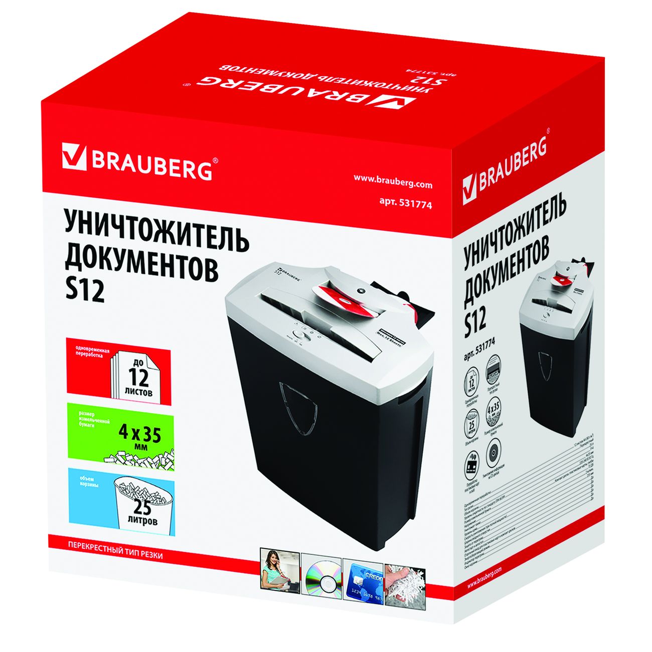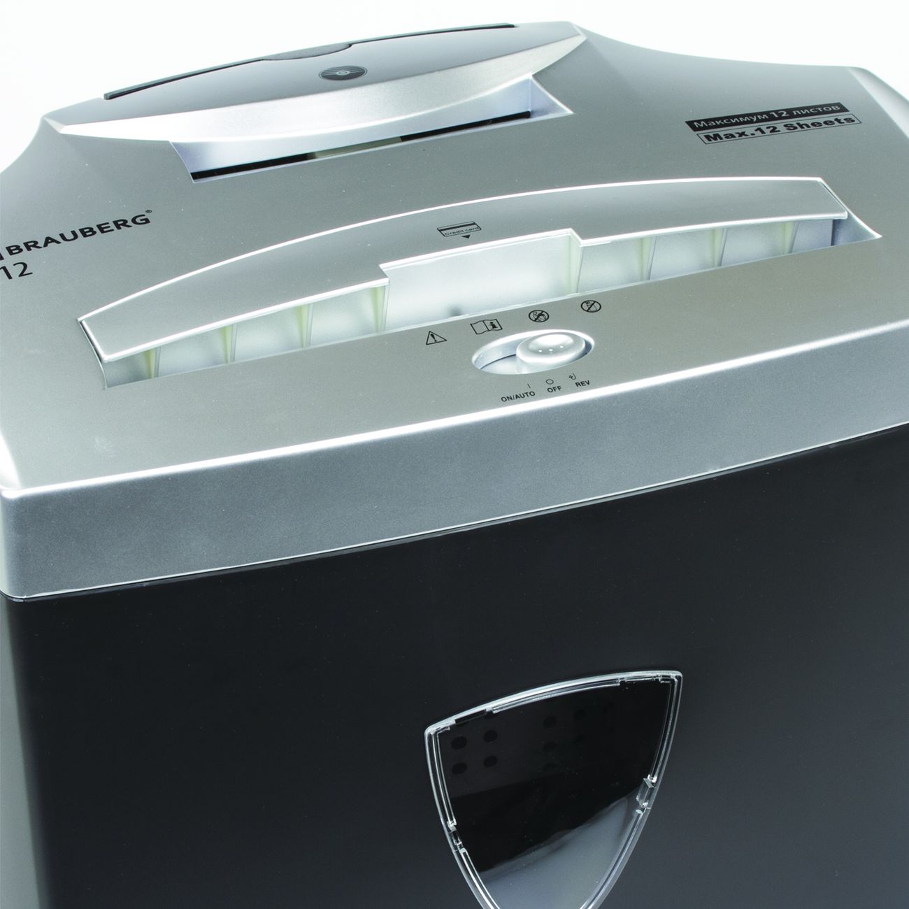 Шредер Brauberg S12 будет удобен для небольшого офиса. Рекомендованное количество пользователей составляет три-пять человек. Устройство эффективно справляется с бумагой, в том числе скреплённой металлическими скобками, и пластиковыми картами.