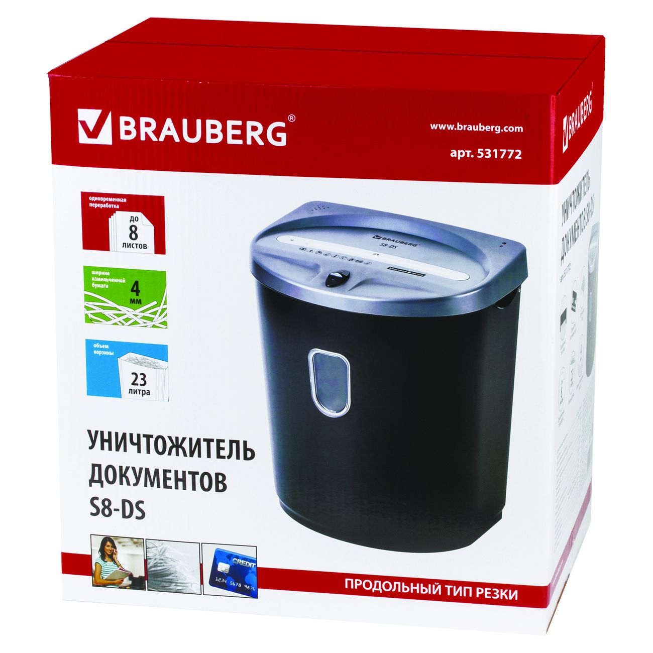 Шредер Brauberg S8-DS будет удобен для малого офиса. Рекомендованное количество пользователей составляет три-пять человек. Устройство эффективно справляется с бумагой, в том числе скреплённой металлическими скобками, и пластиковыми картами.